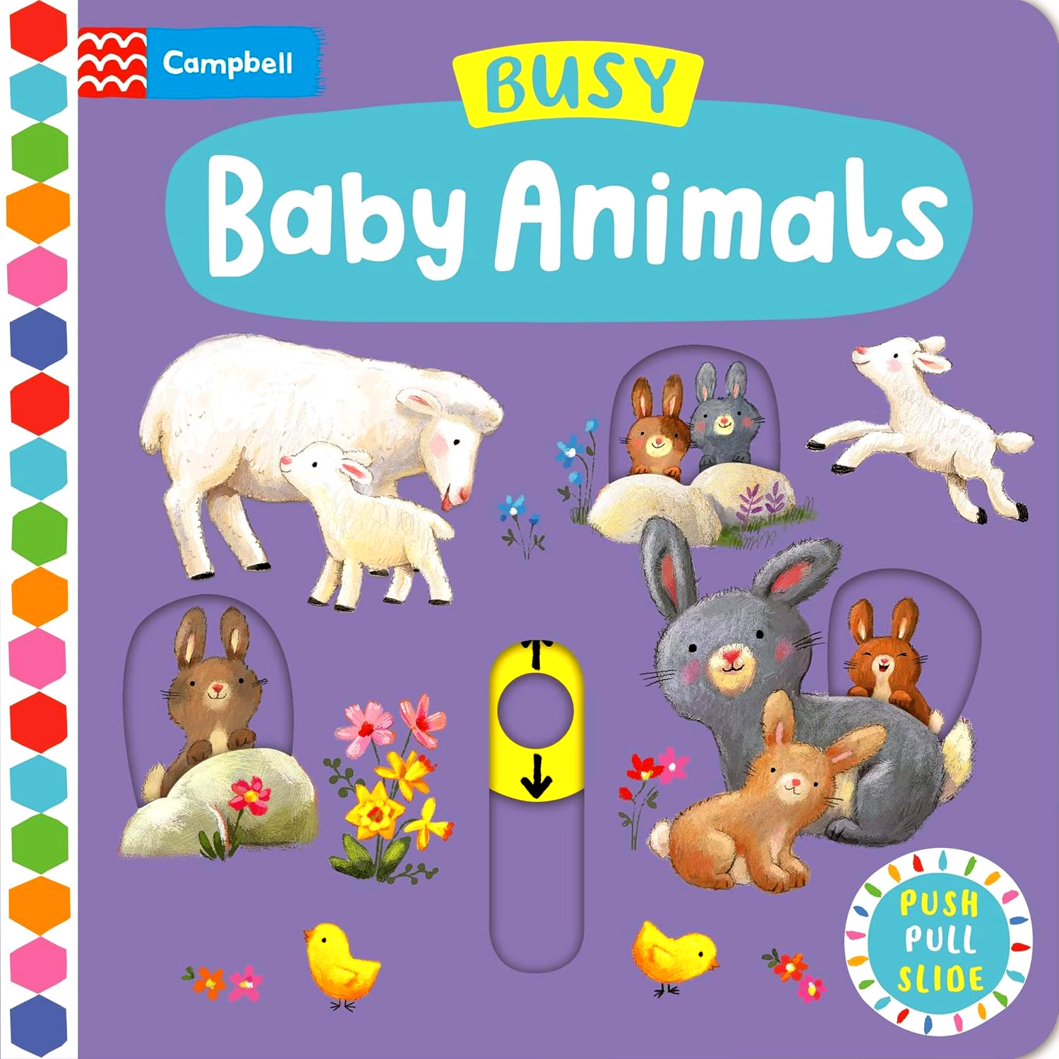 Push, pull and slide the tabs to meet all the Busy Baby Animals. See lambs leaping in the field, piglets playing in the mud and cheeping chicks as they hatch.