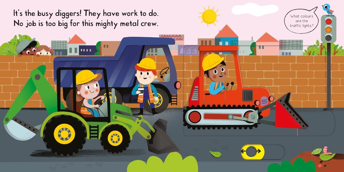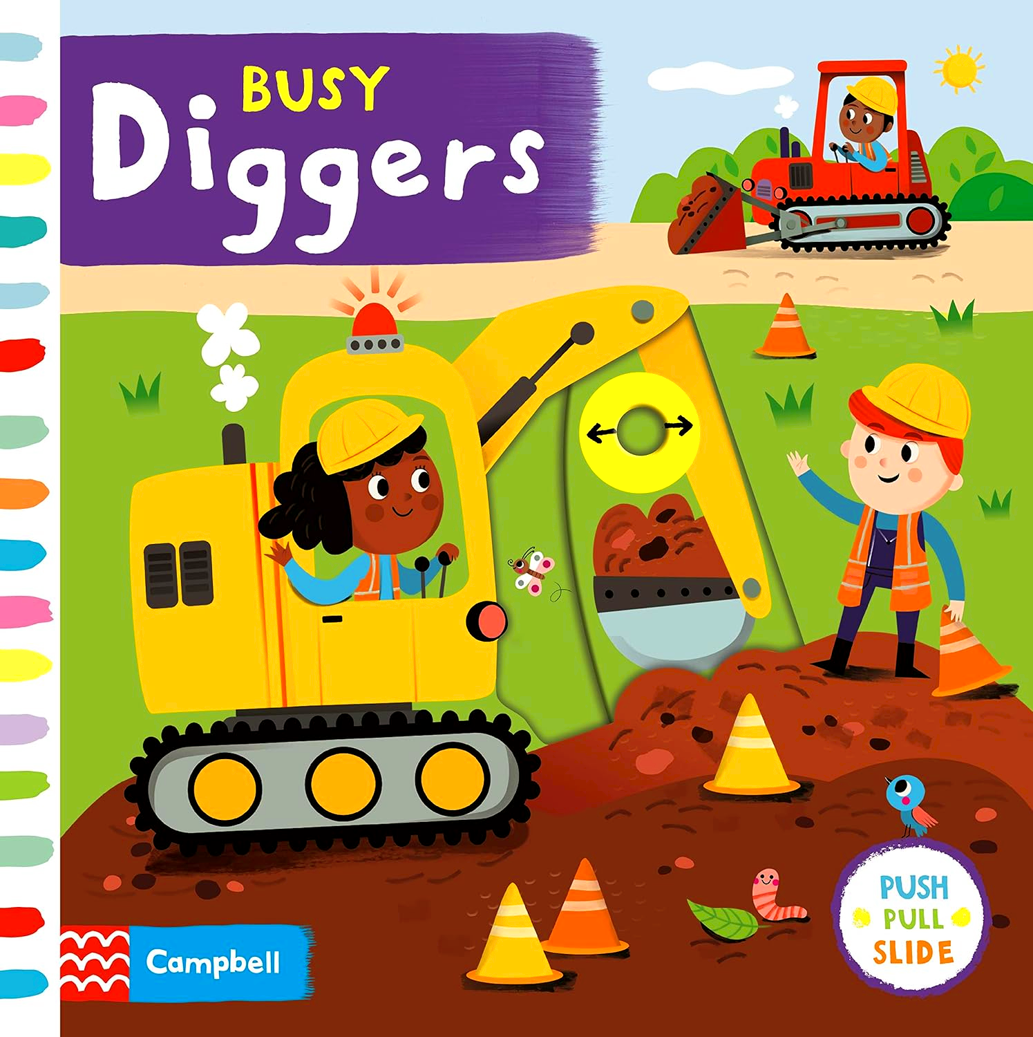 Push, pull and slide the tabs to get to work in Busy Diggers. Scoop up dirt, clear rubble and control mighty metal machines in this fun book about diggers and everything they do at the building site.