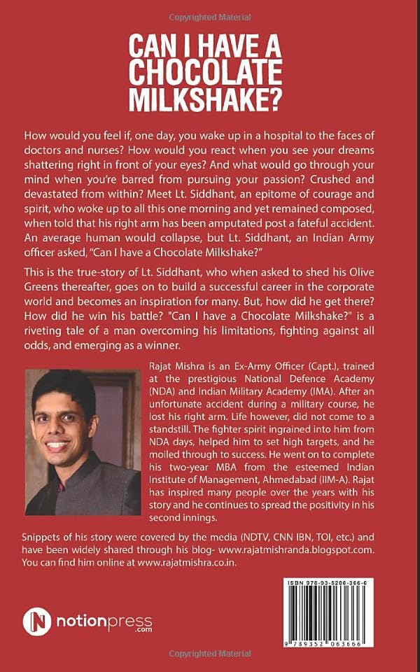 This is the true-story of Lt. Siddhant, who when asked to shed his Olive Greens thereafter, goes on to build a successful career in the corporate world and becomes an inspiration for many. But, how did he get there? How did he win his battle? "Can I have a Chocolate Milkshake?" is a riveting tale of a man overcoming his limitations, fighting against all odds, and emerging as a winner.