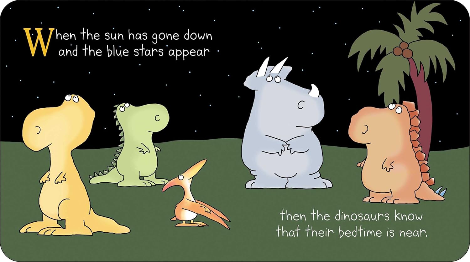 Ah, all those dinosaurs look so cute in their pajamas. See them yawn and stretch and brush their teeth. Soon they’ll be sound asleep, and…OH NO! SNORING!