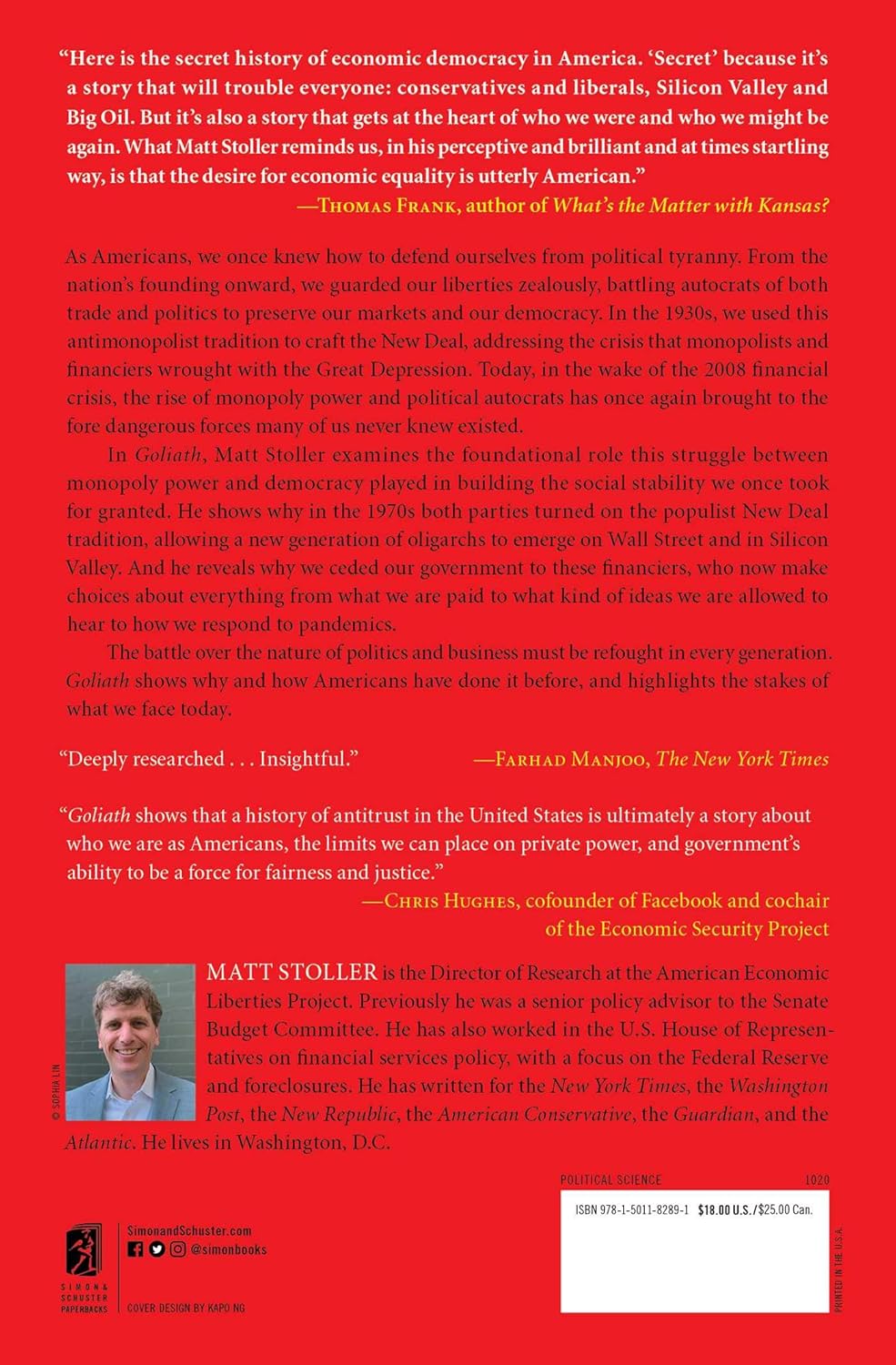 In Goliath, Matt Stoller explains how authoritarianism and populism have returned to American politics for the first time in eighty years, as the outcome of the 2016 election shook our faith in democratic institutions. It has brought to the fore dangerous forces that many modern Americans never even knew existed. Today’s bitter recriminations and panic represent more than just fear of the future, they reflect a basic confusion about what is happening and the historical backstory that brought us to this moment.