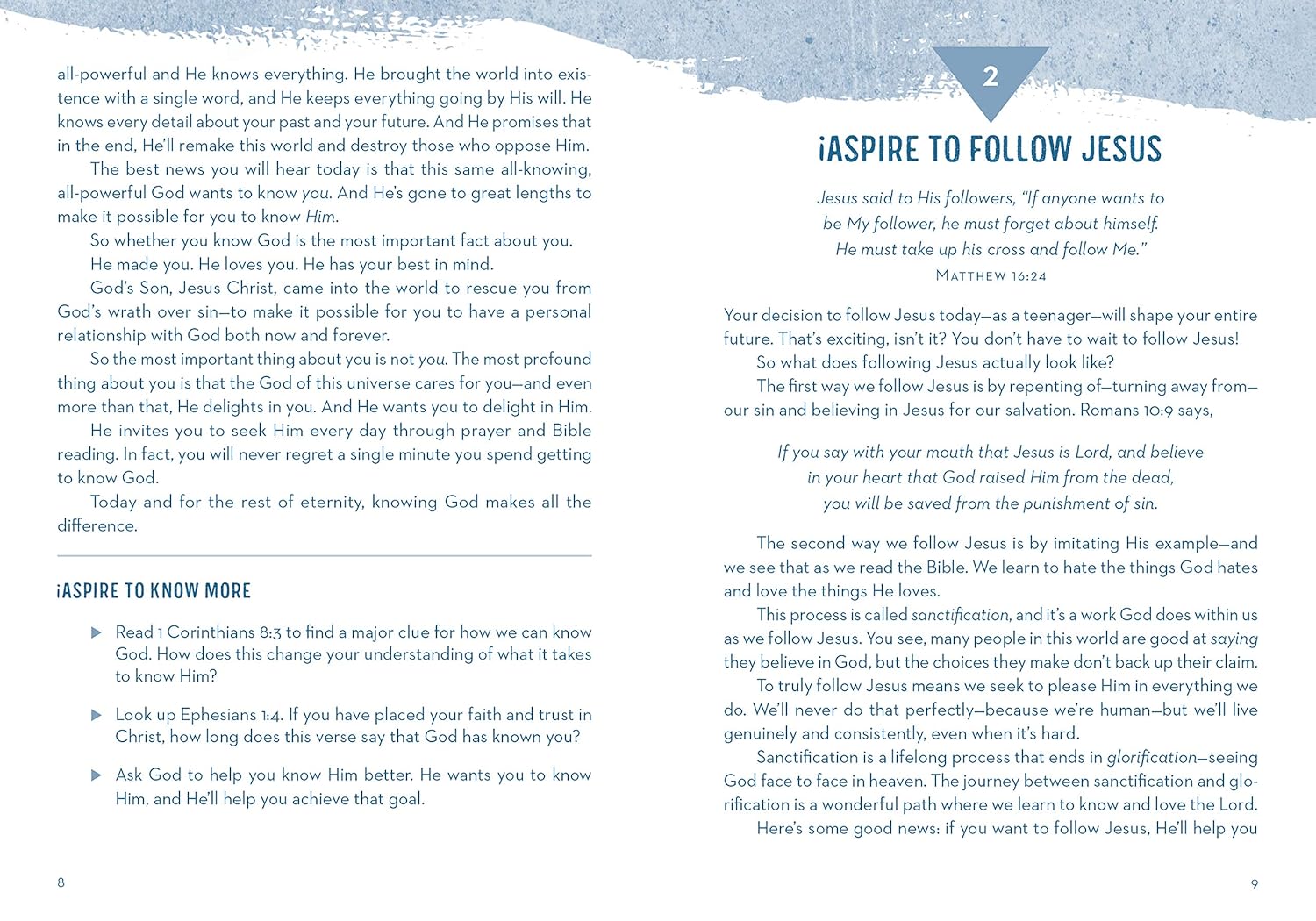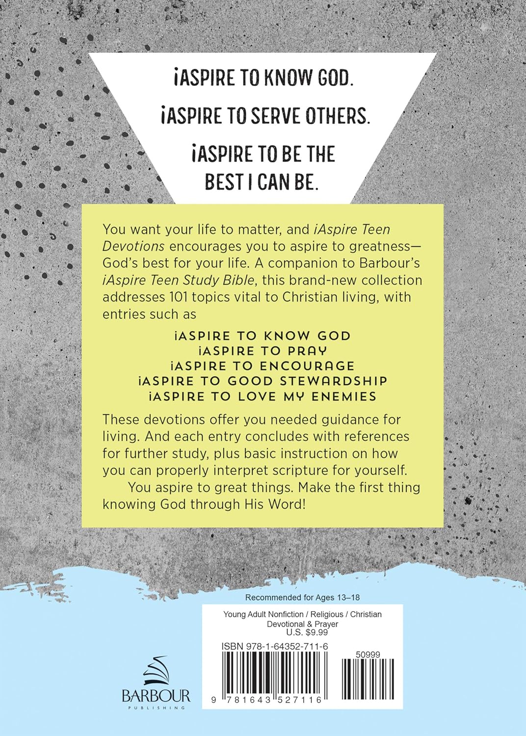 You want your life to matter, and iAspire Teen Devotions encourages you to aspire to greatness&;God&;s best for your life. A companion to Barbour&;s iAspire Teen Study Bible, this brand-new collection addresses 101 topics vital to Christian living, with entries such as