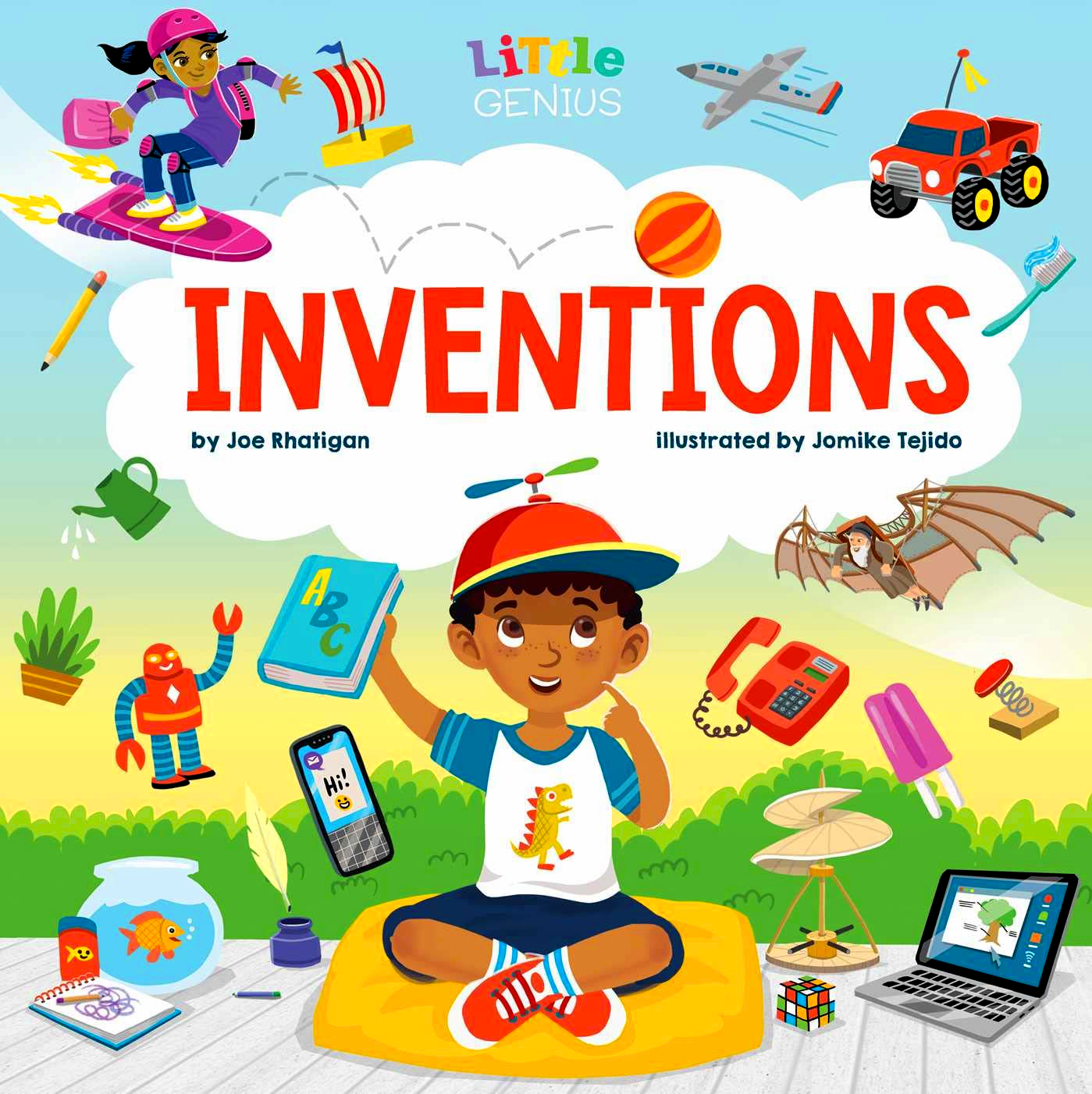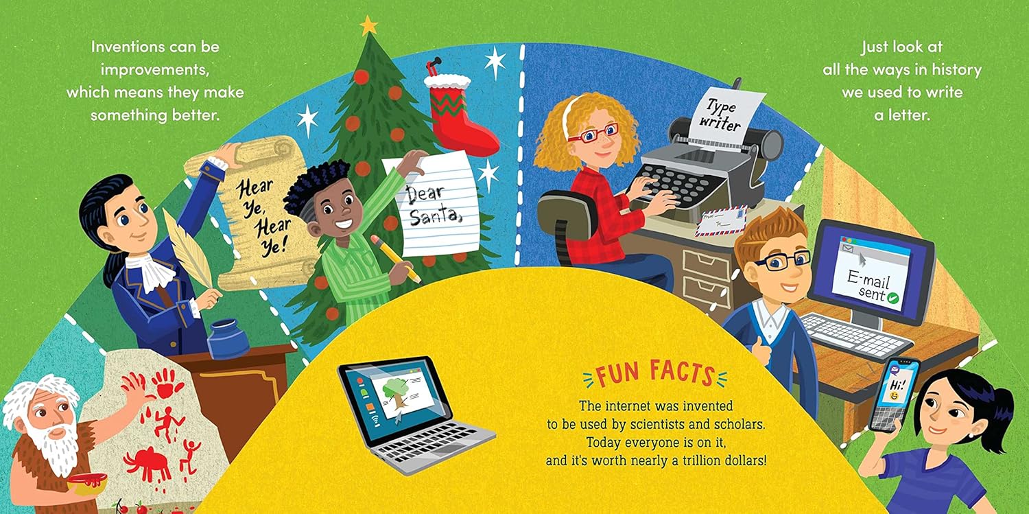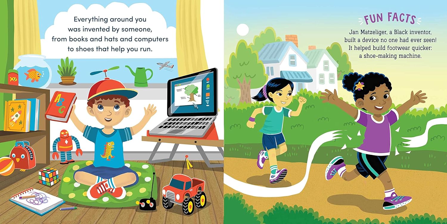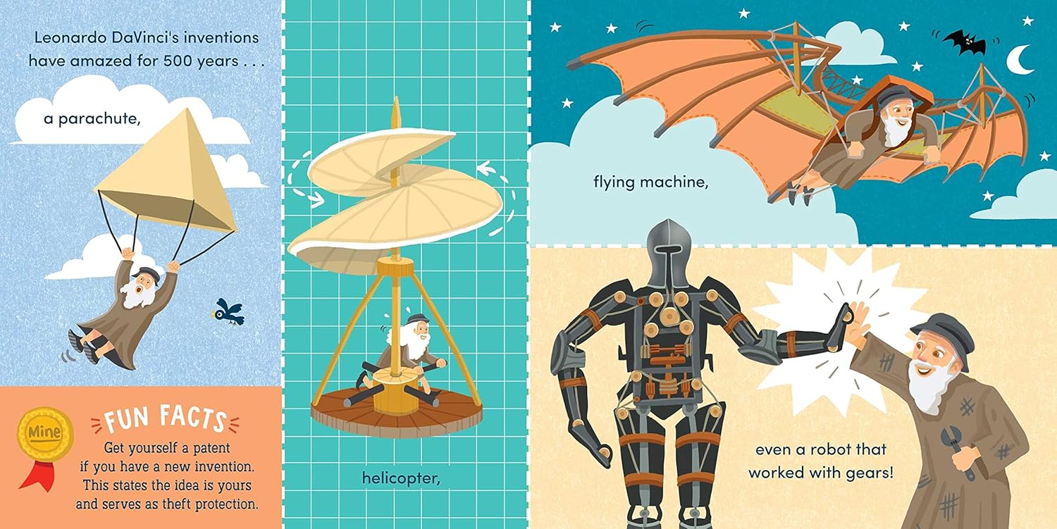 Learn All About Inventions! From quills to computers, light bulbs and airplanes and more, Little Genius Inventions is the perfect first inventions book for little learners with big imaginations. Each spread features amazing inventions, such as books, computers, DaVinci’s helicopter, toothbrushes, and more. Also covered are inventions that didn’t work out (car boats and flying submarines), Rube Goldberg machines, inventions that were mistakes (potato chips), and inventions to look out for in the future (hovercrafts and jetpacks).