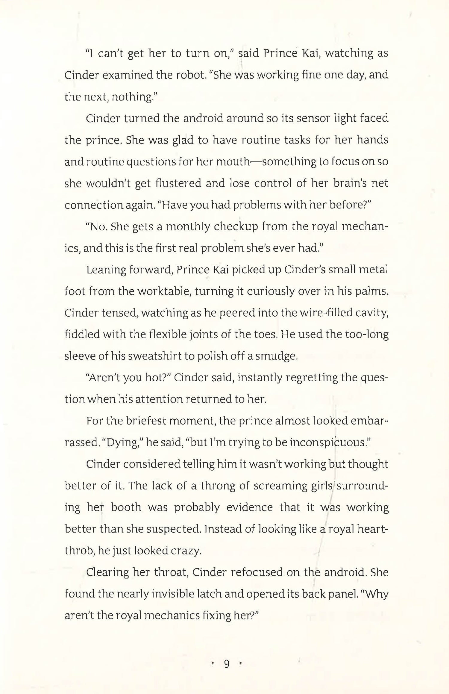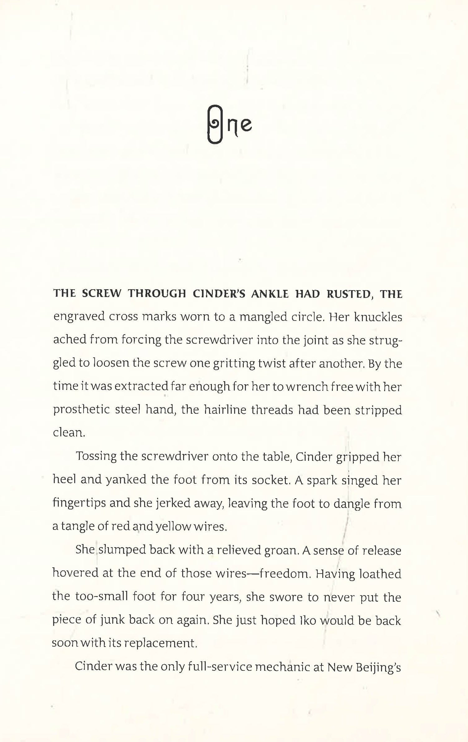 Cinder, a gifted mechanic, is a cyborg. She's a second-class citizen with a mysterious past, reviled by her stepmother and blamed for her stepsister's illness. But when her life becomes intertwined with the handsome Prince Kai's, she suddenly finds herself at the center of an intergalactic struggle, and a forbidden attraction. Caught between duty and freedom, loyalty and betrayal, she must uncover secrets about her past in order to protect her world's future.