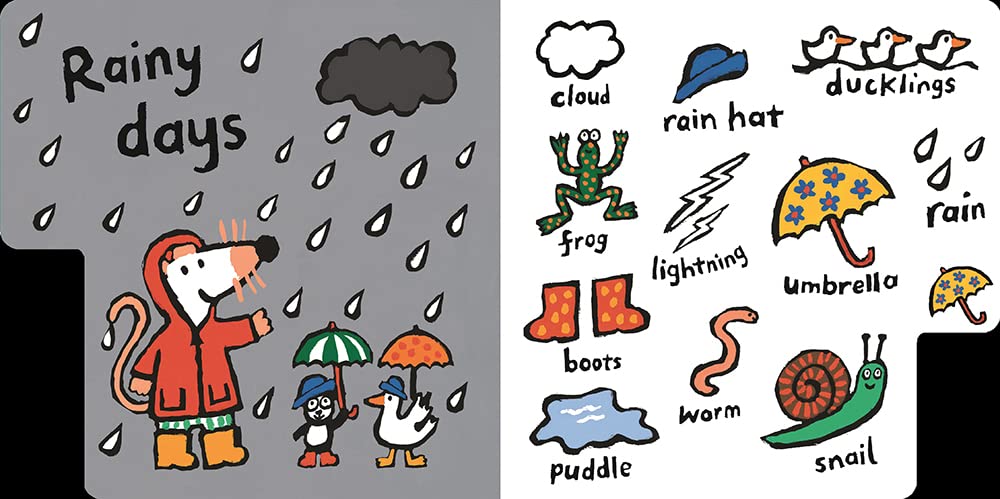 What kinds of things does Maisy see when she goes outside? Turn to the tab with a soccer ball on it to find the park, with swings and a skateboard. The tab with a chicken on it takes you to Maisy’s favorite farm, with a horse, a sheep, and more. There’s so much to explore on the beach and in the sea, on sunny days and rainy ones, on trains and in fire engines and all sorts of things that go. Naming everyday things is always more fun with Maisy leading the way!