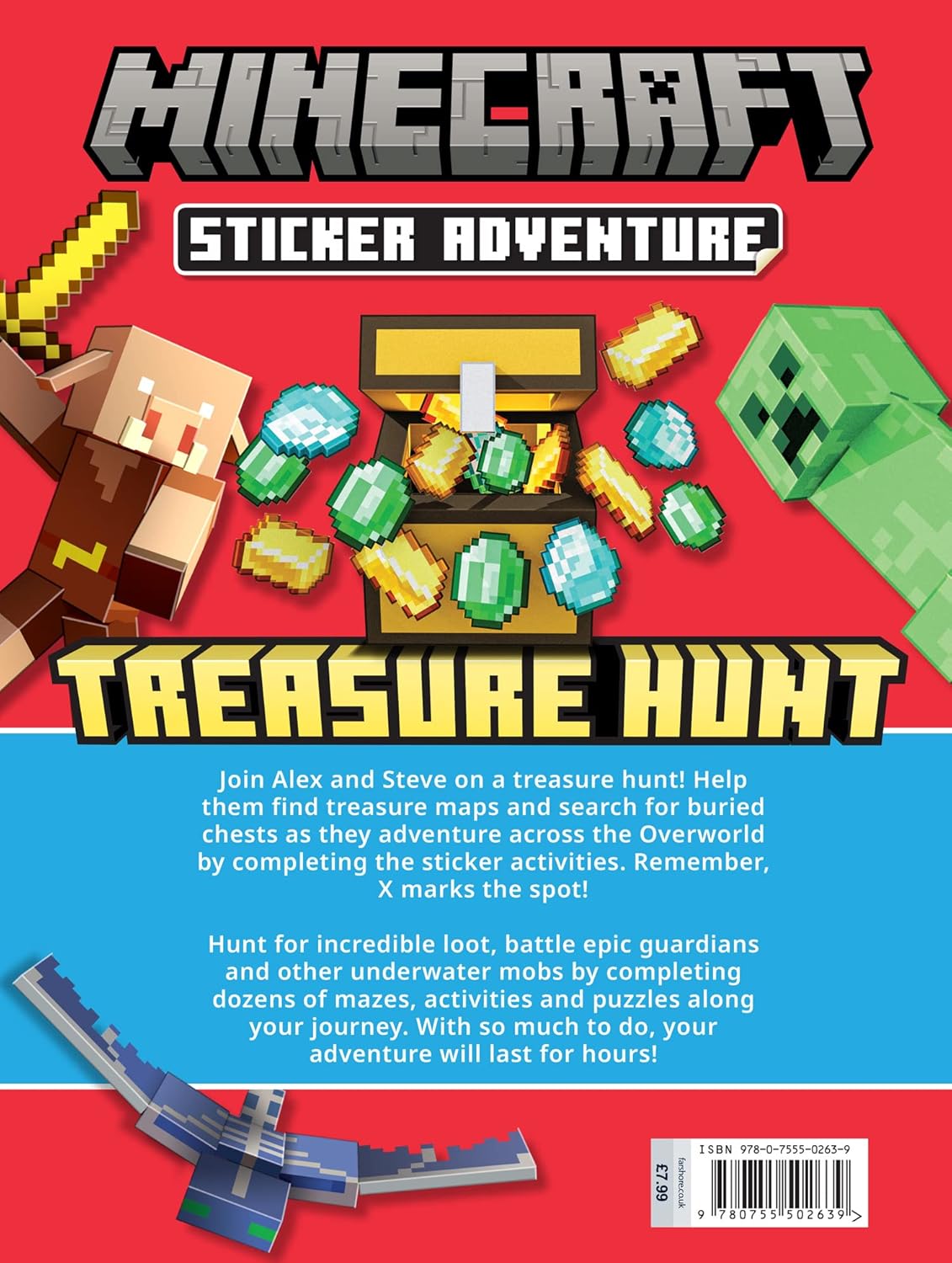 Join Alex and Steve on a treasure hunt! Help them find treasure maps and search for buried chests as they adventure across the Overworld by completing the sticker activities. Remember, X marks the spot!