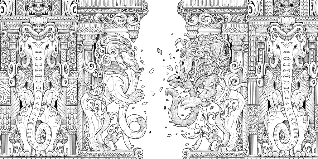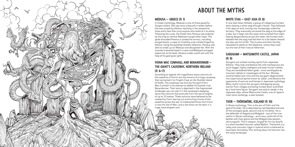 Mythic World features over 55 mythical creatures and legends to colour. Showcasing some of the best-known creatures alongside some you might not have discovered before, each scene shows them interacting with and morphing out of some of the most distinctive landscapes in our world today. Warring giants morph out of The Giant's Causeway in Northern Ireland, petrified trolls come back to life in Icelandic rock formations, the Bhutanese Druk emerges from Mount Everest's cloudy summit and much more.