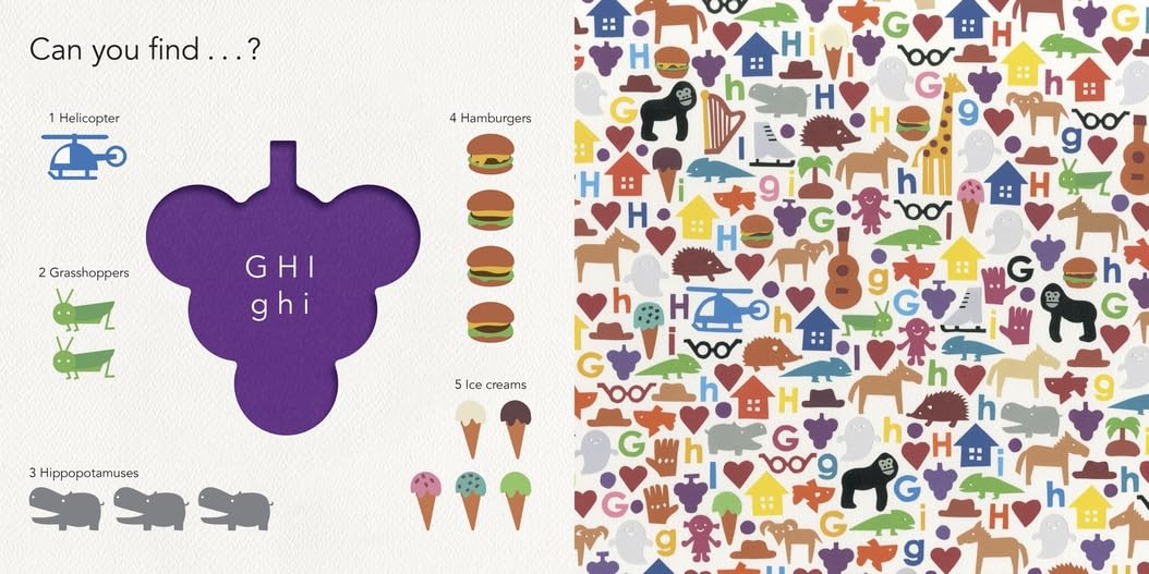 Peek through an ant-shaped opening to see an intricate pattern made of colorful objects, animals, and graphic shapes. Turn the page, and the letters ABC emerge, as the pattern expands to include many more components. Can you find one armadillo hidden among them? Two bicycles? Three camels? With an equally jam-packed spread for every three letters of the alphabet, this search-and-find concept book promises a mesmerizing activity for children―and a satisfying visual experience for fans of graphic design.