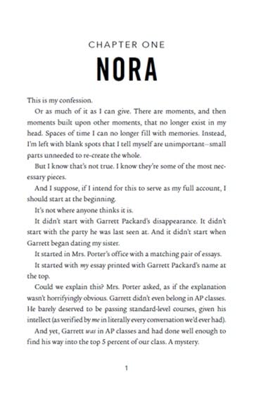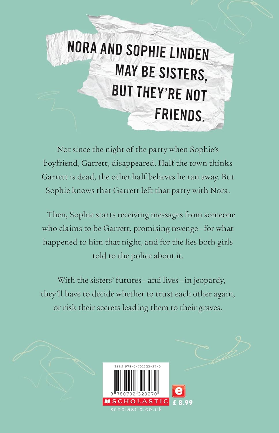 TWO SISTERS. ONE GIRL'S BOYFRIEND GOES MISSING AND HER SISTER IS THE PRIMARY SUSPECT When her boyfriend Garrett disappears, Sophie knows that he left that party with straight-A sister Nora. With the sisters' futures and lives in jeopardy, they'll have to decide whether to trust each other again, or risk their secrets leading them to their graves.