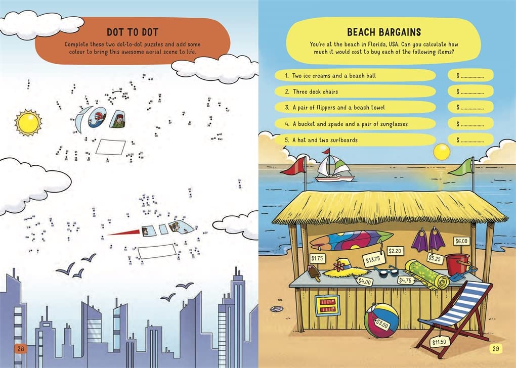 With over 80 puzzles to complete, readers can spot the differences between two island scenes, match up pairs of surfboards in the sand and fill in a seashell sudoku. Kids can also put their brain-power to the test with mind-bending mazes, dot-to-dots, travel-themed quizzes and much more.