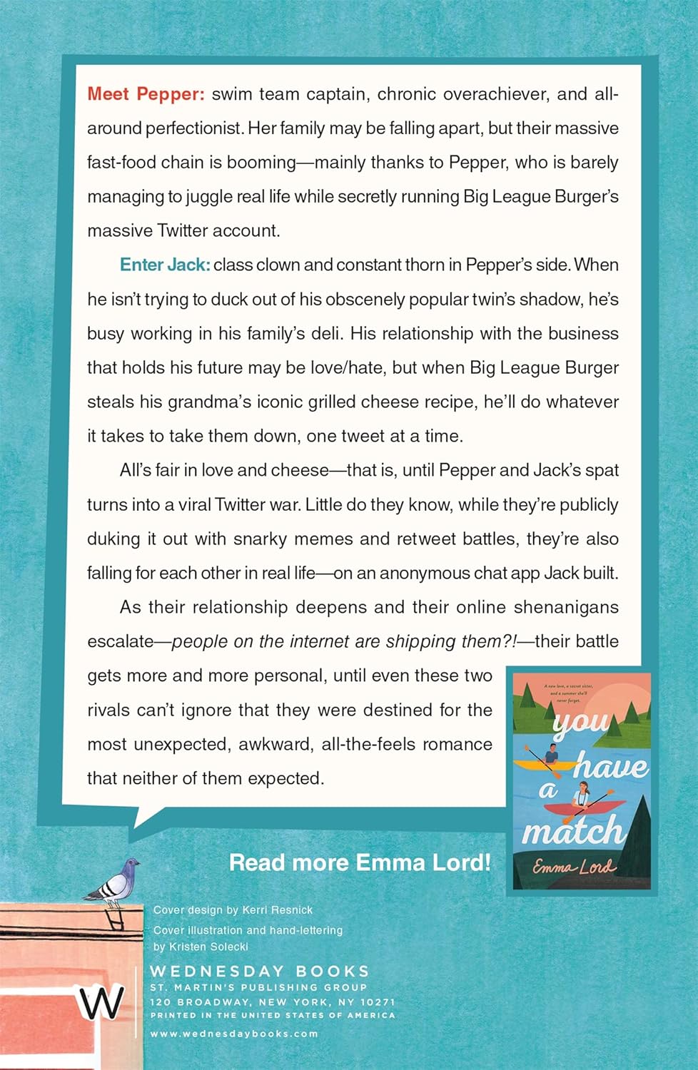 Meet Pepper, swim team captain, chronic over achiever, and all-around perfectionist. Her family may be falling apart, but their massive fast-food chain is booming - mainly thanks to Pepper, who is barely managing to juggle real life while secretly running Big League Burger’s massive Twitter account. Enter Jack, class clown and constant thorn in Pepper’s side. When he isn’t trying to duck out of his obscenely popular twin’s shadow, he’s busy working in his family’s deli. His relationship with the business that holds his future might be love/hate, but when Big League Burger steals his grandma’s iconic grilled cheese recipe, he’ll do whatever it takes to take them down, one tweet at a time. All’s fair in love and cheese - that is, until Pepper and Jack’s spat turns into a viral Twitter war. Little do they know, while they’re publicly duking it out with snarky memes and retweet battles, they’re also falling for each other in real life - on an anonymous chat app Jack built. As their relationship deepens and their online shenanigans escalate - people on the internet are shipping them?? - their battle gets more and more personal, until even these two rivals can’t ignore they were destined for the most unexpected, awkward, all-the-feels romance that neither of them expected.