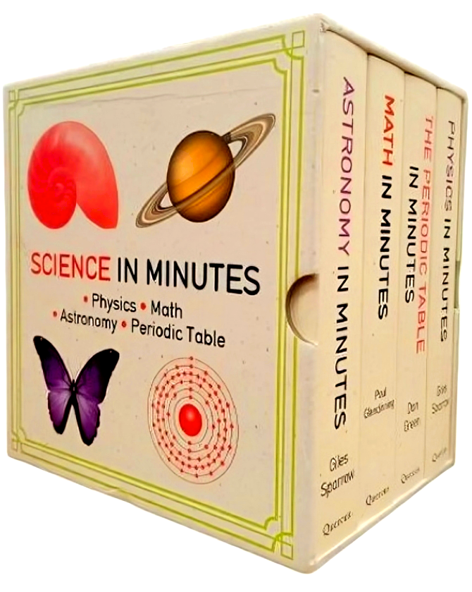 Science In Minutes 4 Paperback Book set includes - Math - Physics - Astronomy - Periodic Table. The quickest & easiest way to learn the fundamentals of physics, maths, astronomy and the periodic table with 800 key ideas in an instant.