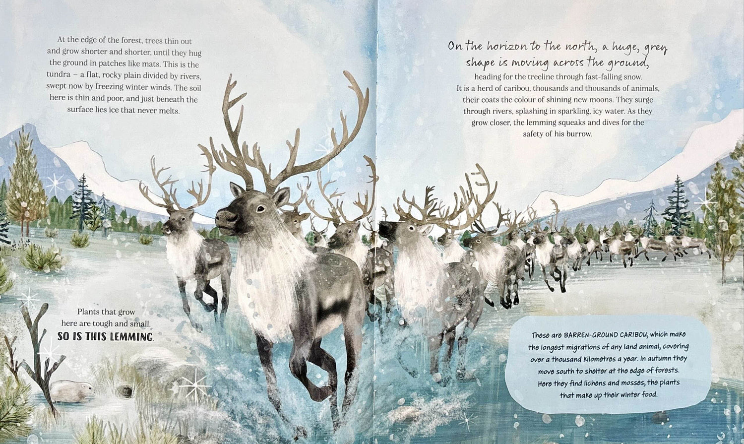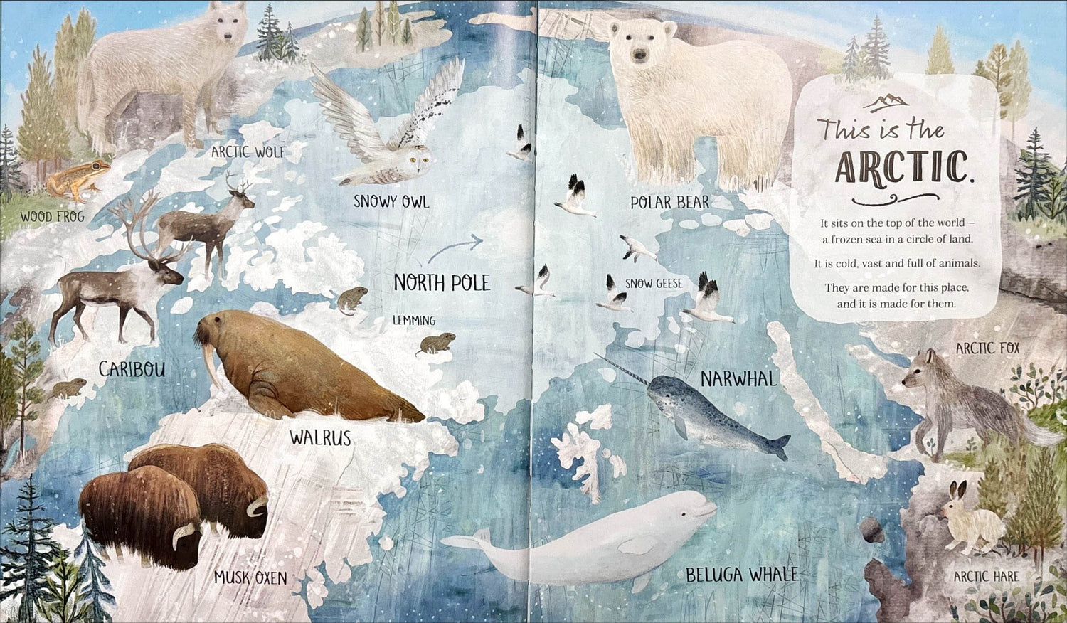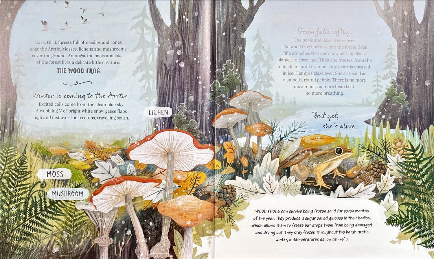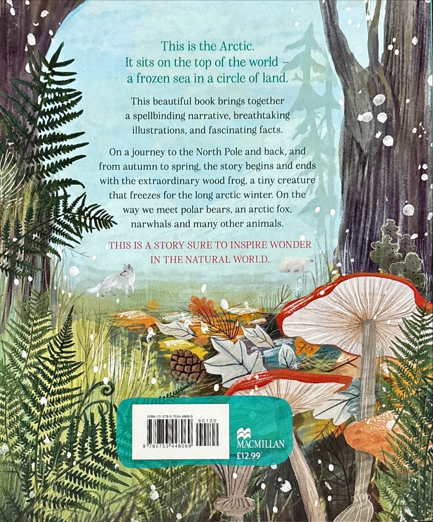 This beautiful book brings together a spellbinding narrative, breathtaking illustrations and fascinating facts about one of our planet’s most precious environments. On a journey to the North Pole and back, and from autumn to spring, the story begins and ends with the extraordinary wood frog, a tiny creature that freezes for the long Arctic winter. On the way we meet polar bears, an Arctic fox, narwhals and many other animals, discovering how each one is perfectly adapted for life on the tundra, in the ocean and on the ice.