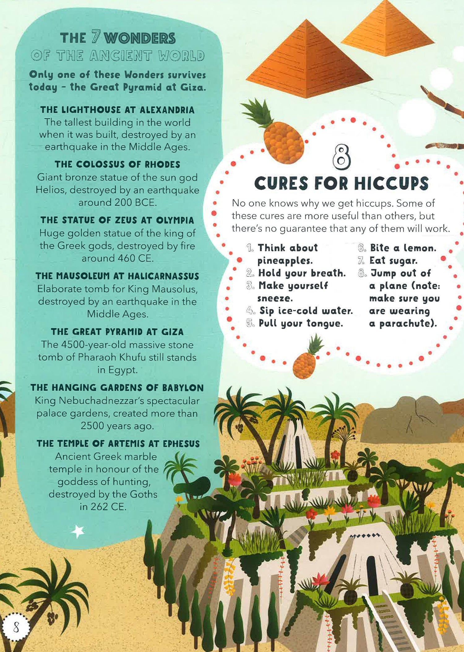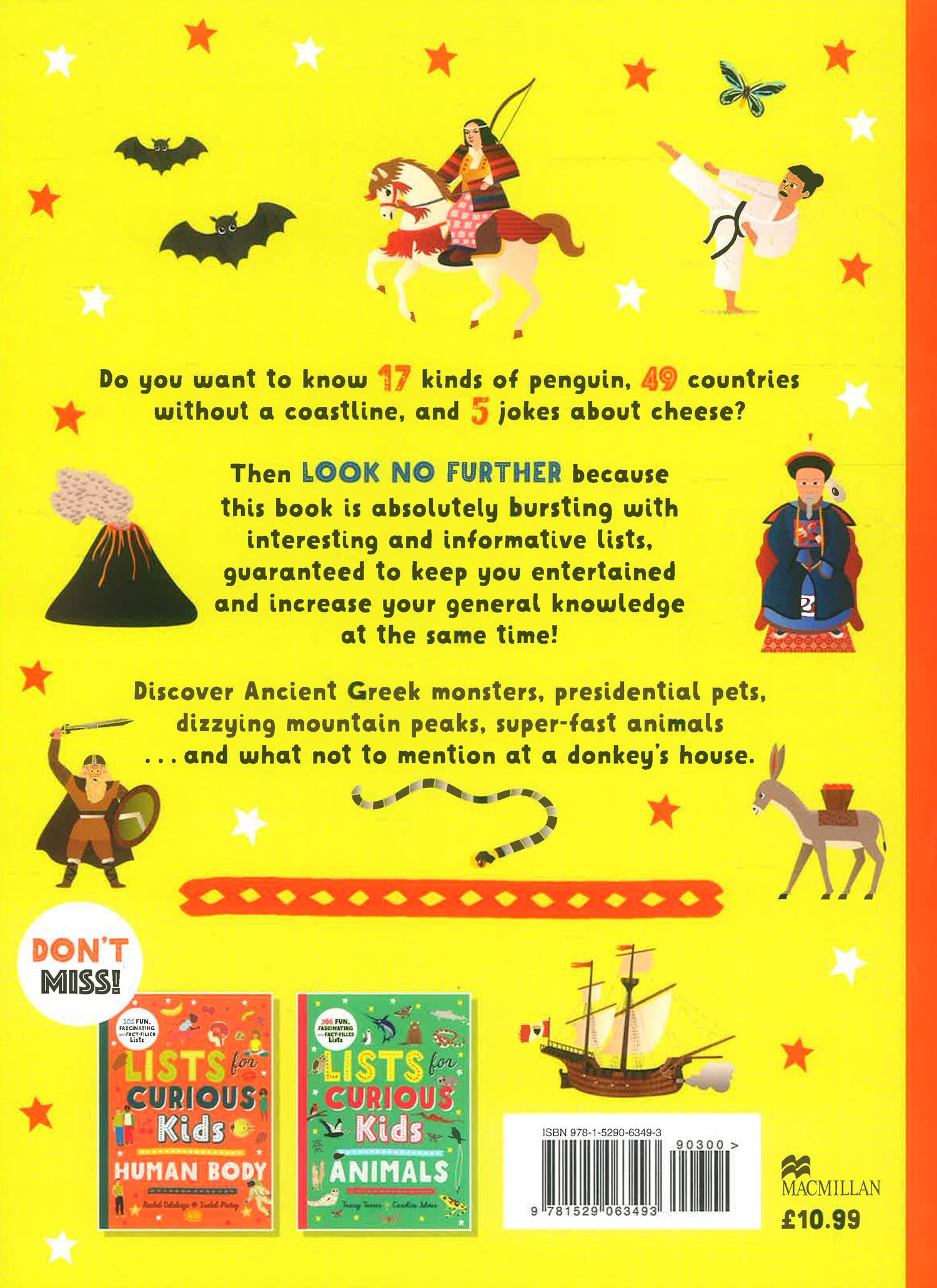 Then look no further because Lists for Curious Kid by Tracey Turner is absolutely bursting with eye-popping and informative lists from around the world, guaranteed to keep you entertained and increase your general knowledge at the same time! Discover Ancient Greek monsters, presidential pets, dizzying mountain peaks, super-fast animals … and what not to mention at a donkey’s house.