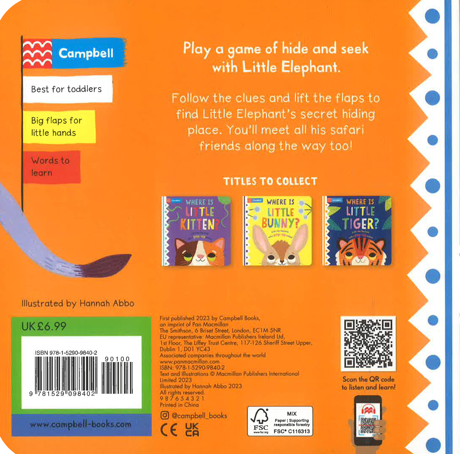 Young children can follow the clues and lift the sturdy flaps with peep-through holes to see if Elephant is hiding underneath. There are lots of animal friends to meet along the way, as well as a surprise pop-up ending to reveal Elephant's hiding place. Bright, bold illustration from Jean Claude makes this an ideal gift purchase for animal-mad toddlers.