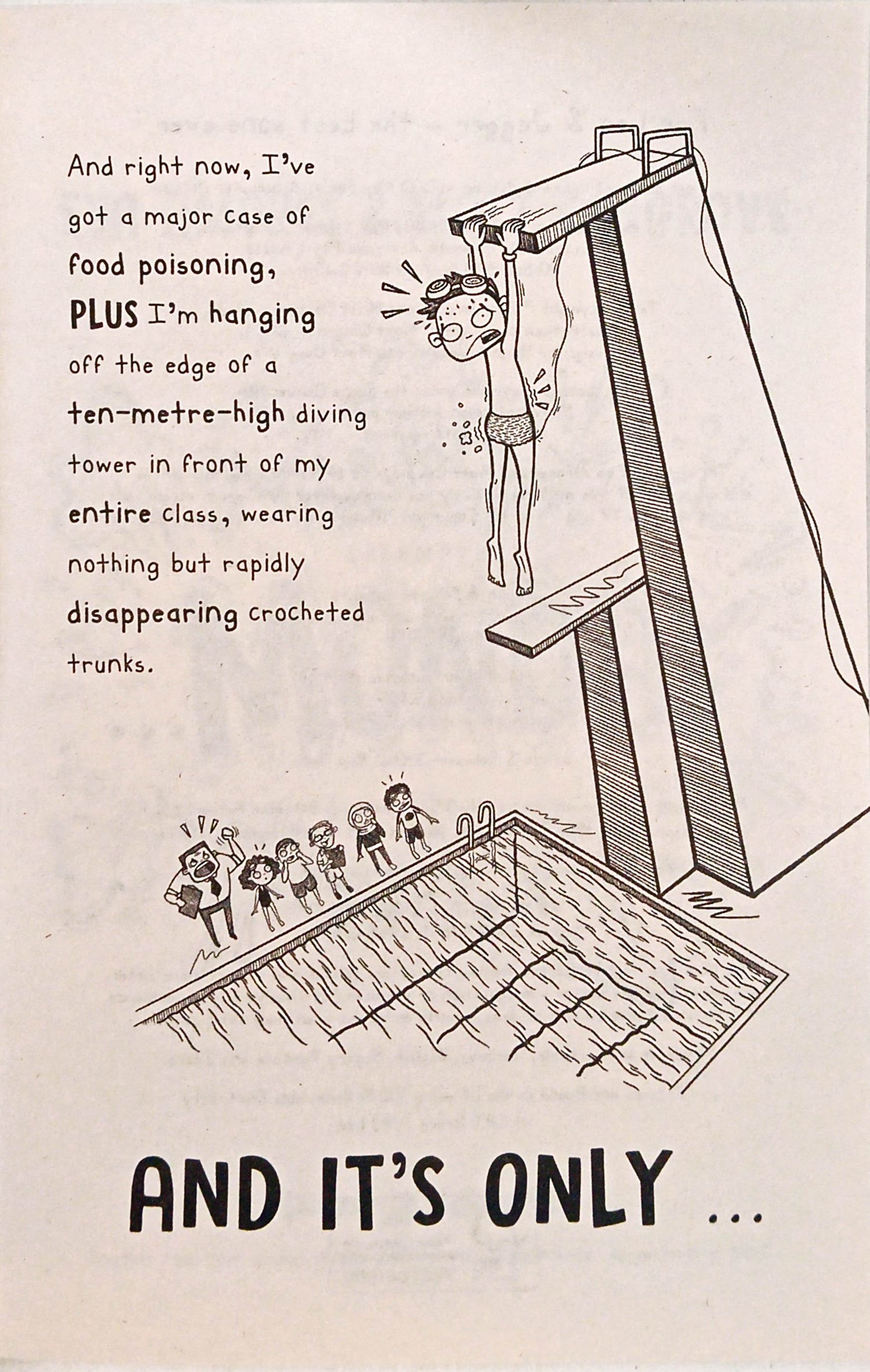 At least he has the perfect chance to show off his prowess in the swimming pool, right? Maybe not... As right now, he's dangling off the edge of a 10-metre-high diving tower in front of his entire class wearing nothing but rapidly disappearing crocheted trunks!