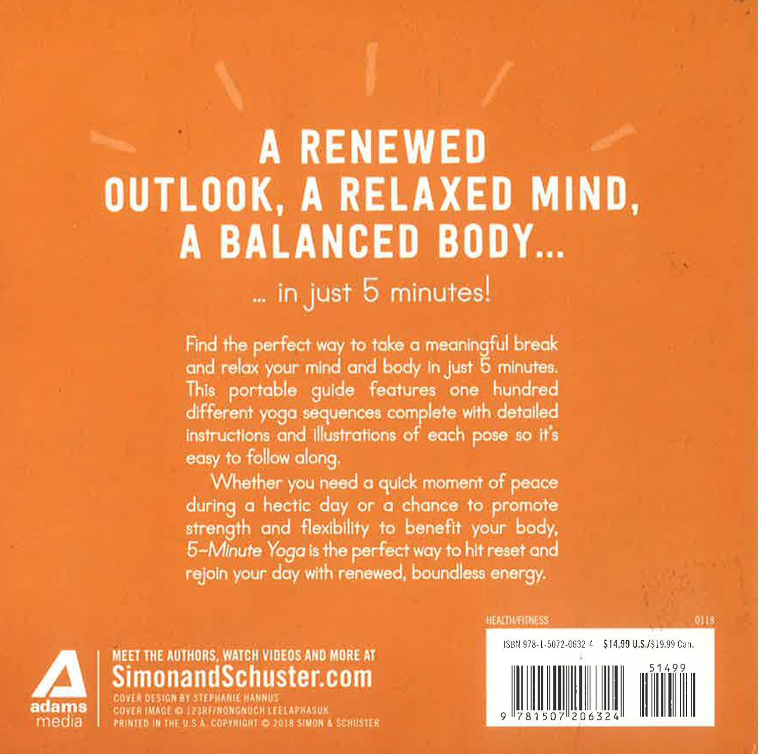 In 5-Minute Yoga, you’ll find 100 yoga sequences that can help you refresh your body and mind in only five minutes. Each sequence—designed to provide a specific benefit to your body, mind, and spirit—contains a detailed explanation with illustrations of each pose so it’s easy to follow along.