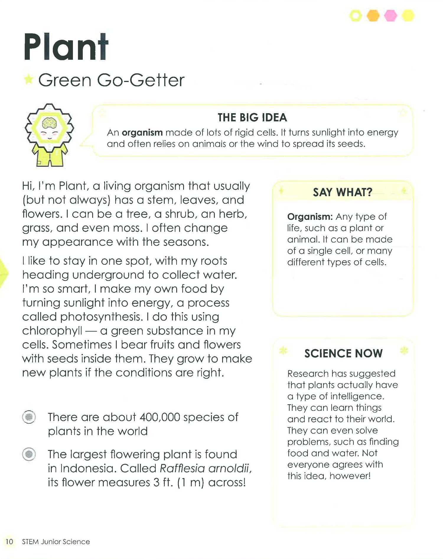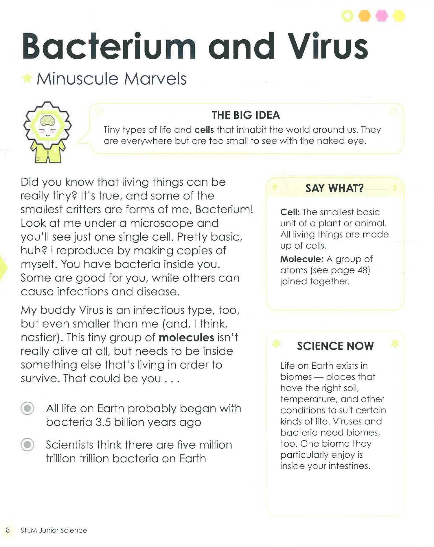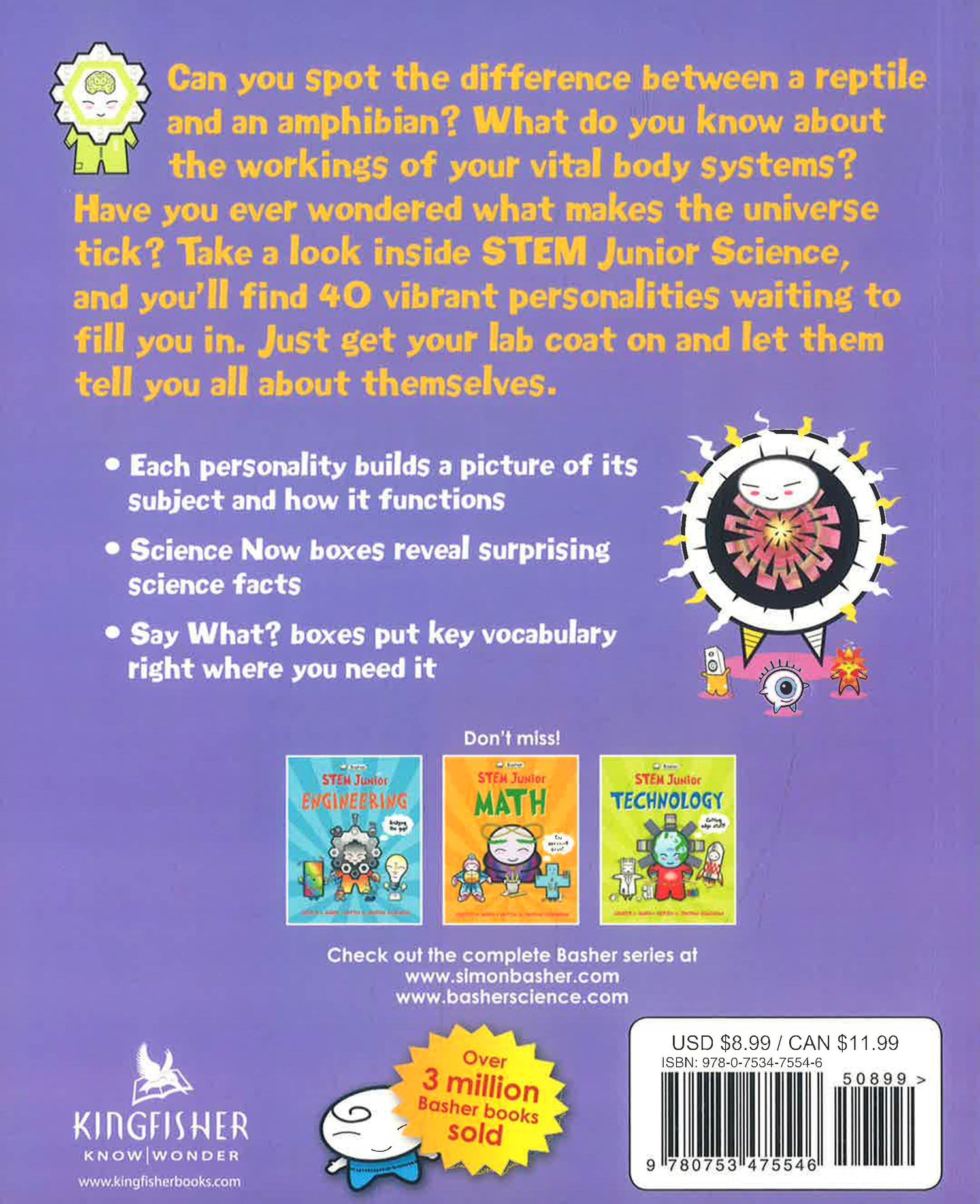 One of four books in an exciting STEM series for younger children, STEM Junior: Science covers 40 topics from the core subjects of biology, chemistry, and physics. Each topic is introduced as a personality who has plenty to say on the subject, while a STEM Junior character appears on each spread to introduce the big idea behind each topic. Combined with "jargon buster" panels and additional information presented in bitesize boxes, over 100 of Simon Basher's trademark illustrations bring fun, appeal, and humor to the topics. Basher's Stem Junior: Science will help give 7- to 9-year olds a solid foundation in the key topics that make up the core STEM subject of science.