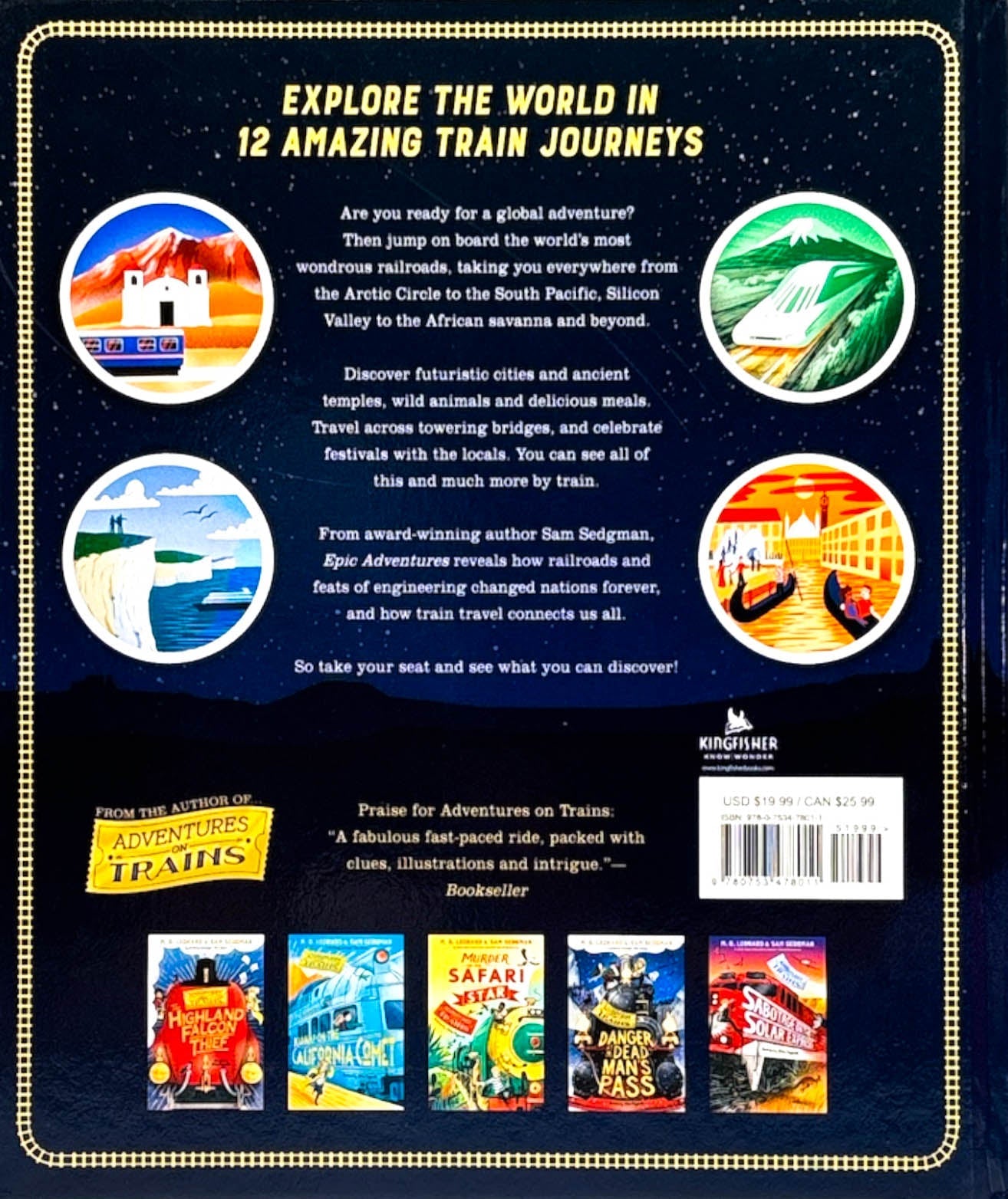 So climb on board and travel across six continents, 34 countries, and numerous cities via 12 of the world's most amazing train journeys. Adventures on Trains author and British Book Award 2021 winner Sam Sedgman brings to life the world’s most epic railroads, including the Orient Express (Paris to Istanbul), the first Transcontinental Railroad (Chicago to San Francisco), and the Rejuvenation Express (Beijing to Hong Kong). Each locomotive adventure reveals the rich history, culture, landscape, and wildlife of the countries traveled.