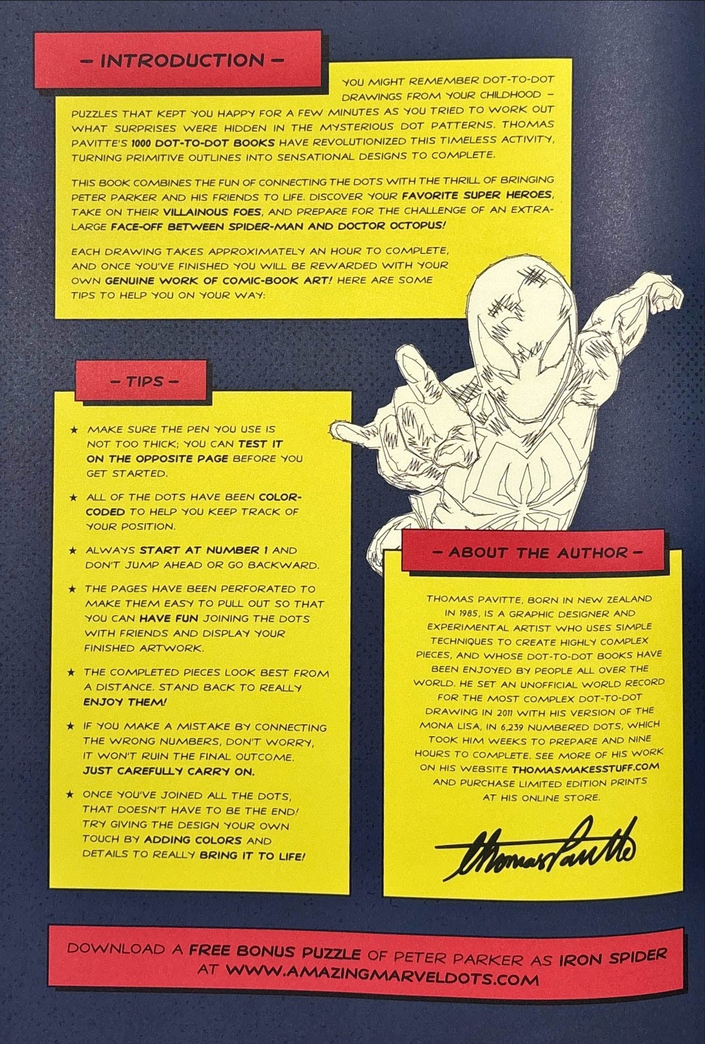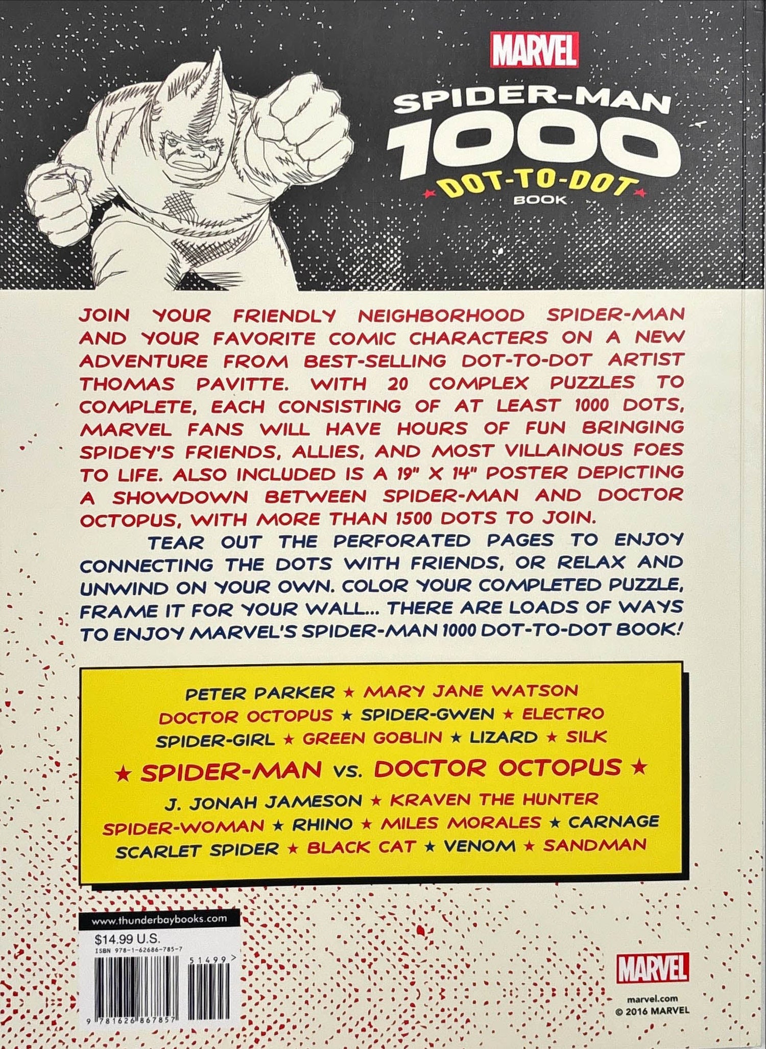Join your friendly neighborhood Spider-Man and all your favorite comic characters on a new adventure from best-selling dot-to-dot artist Thomas Pavitte.With 20 complex puzzles to complete, each consisting of at least 1,000 dots, Marvel fans will have hours of fun bringing Spidey and his friends, allies, and most villainous foes to life.