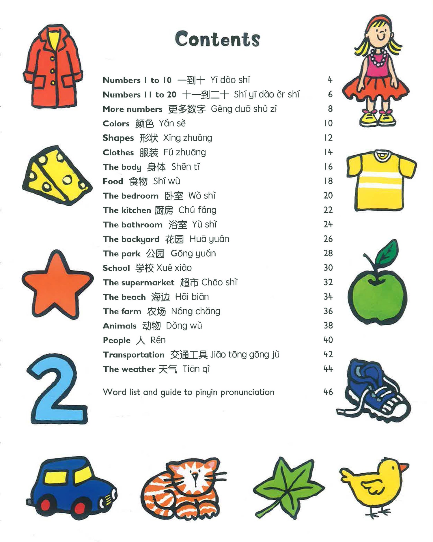 An introduction for parents and teachers suggests strategies for helping children learn most effectively. A complete English-Mandarin word list at the end of the book repeats the words and includes a helpful pronunciation guide and language tips.