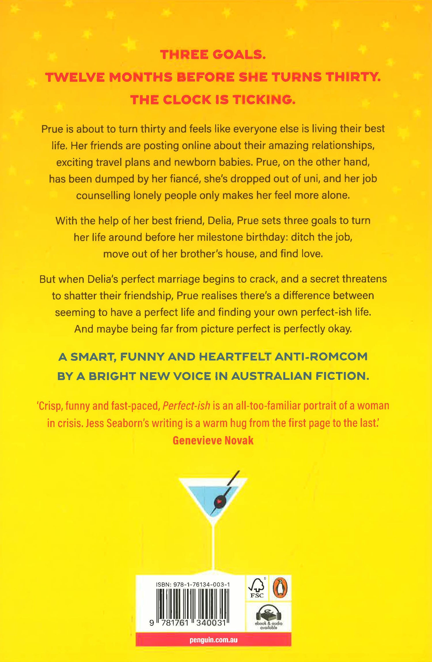 A smart, funny and heartfelt anti-romcom by a bright new voice in Australian fiction. Prue is about to turn thirty and feels like everyone else is living their best life. Her friends are posting online about their amazing relationships, exciting travel plans and newborn babies. Prue, on the other hand, has been dumped by her fiancé , she's dropped out of uni, and her job counselling lonely people only makes her feel more alone. With the help of her best friend, Delia, Prue sets three goals to turn her life around before her milestone birthday: ditch the job, move out of her brother’ s house, and find love. But when Delia’ s perfect marriage begins to crack, and a secret threatens to shatter their friendship, Prue realises there’ s a difference between seeming to have a perfect life and finding your own perfect-ish life. And maybe being far from picture perfect is perfectly okay.
