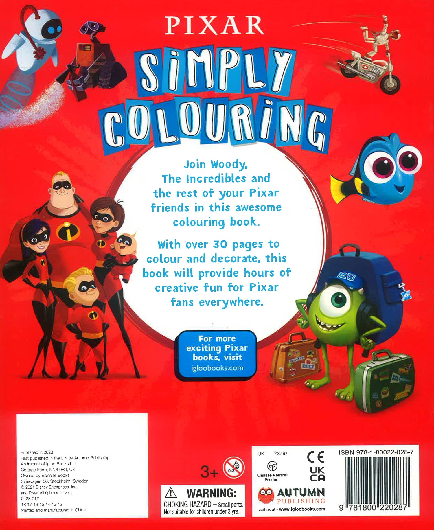 Get your colouring pencils at the ready and join Woody, The Incredibles and the rest of your Pixar friends in this awesome colouring book!