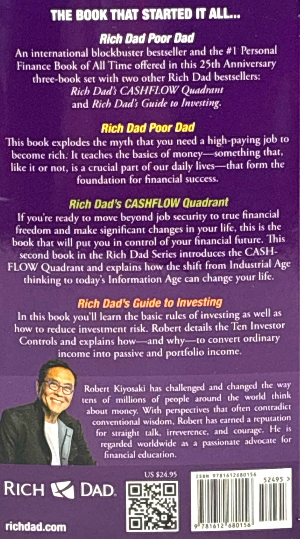 The Rich Dad Classics Boxed Set contains three mass market titles from the Rich Dad Poor Dad series in one boxed set. The boxed set includes: Rich Dad Poor Dad - the best-selling personal finance guide for the millions hoping to become masters of their money. The Cash Flow Quadrant - the follow-up to Rich Dad Poor Dad reveals why some people work less and earn more, pay less taxes, and feel more financially secure than others. Rich Dad's Guide to Investing - the basic rules of investing, including how to reduce investment risk and how to convert earned income into passive and portfolio income.