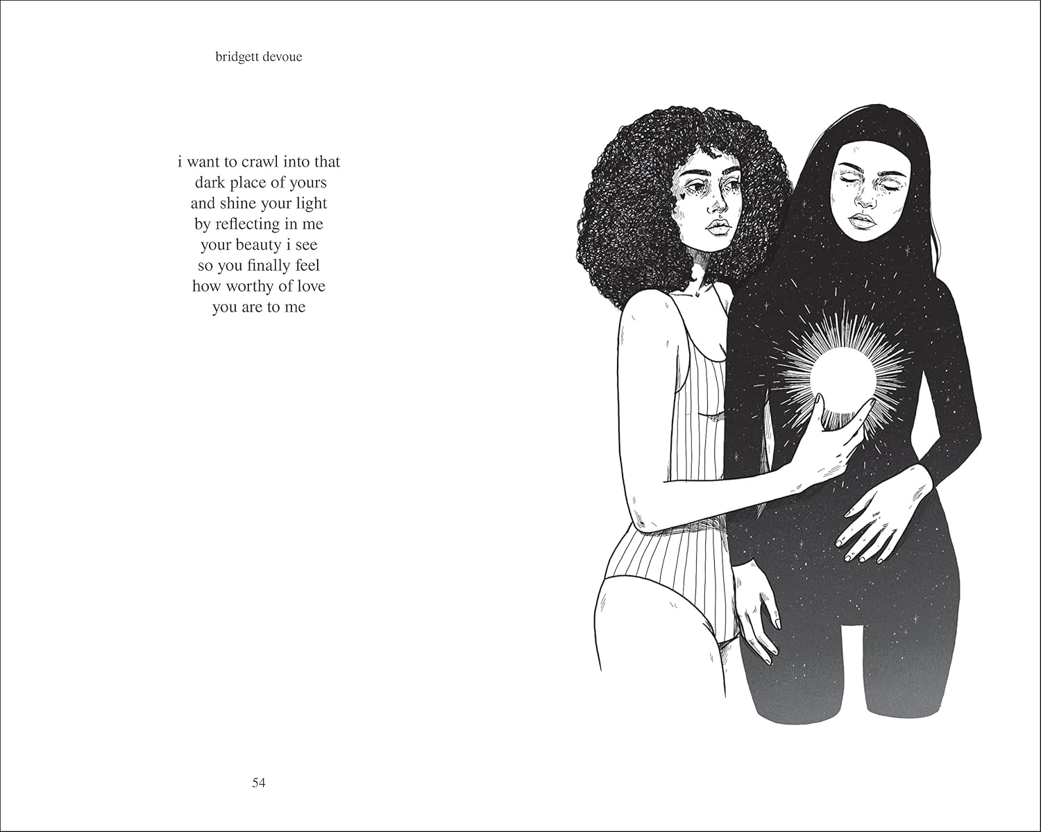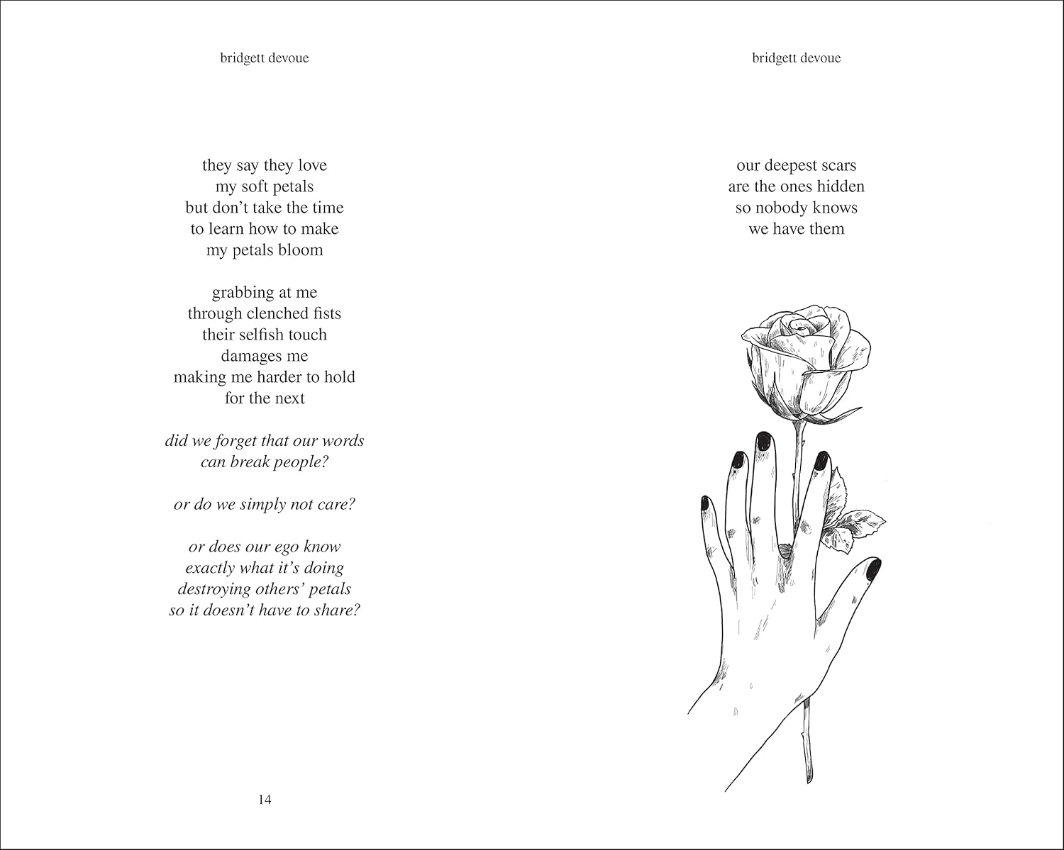 Devoue is not known to shy away from the darkest corners of the human experience; in fact, she dives deep into those waters and allows the reader to explore the shared vulnerabilities that all of us face. Her poems touch on topics such as longing, lust, toxic love, self-destruction, confusing breakups, abuse, and overcoming it all through finding light in even the darkest of places.