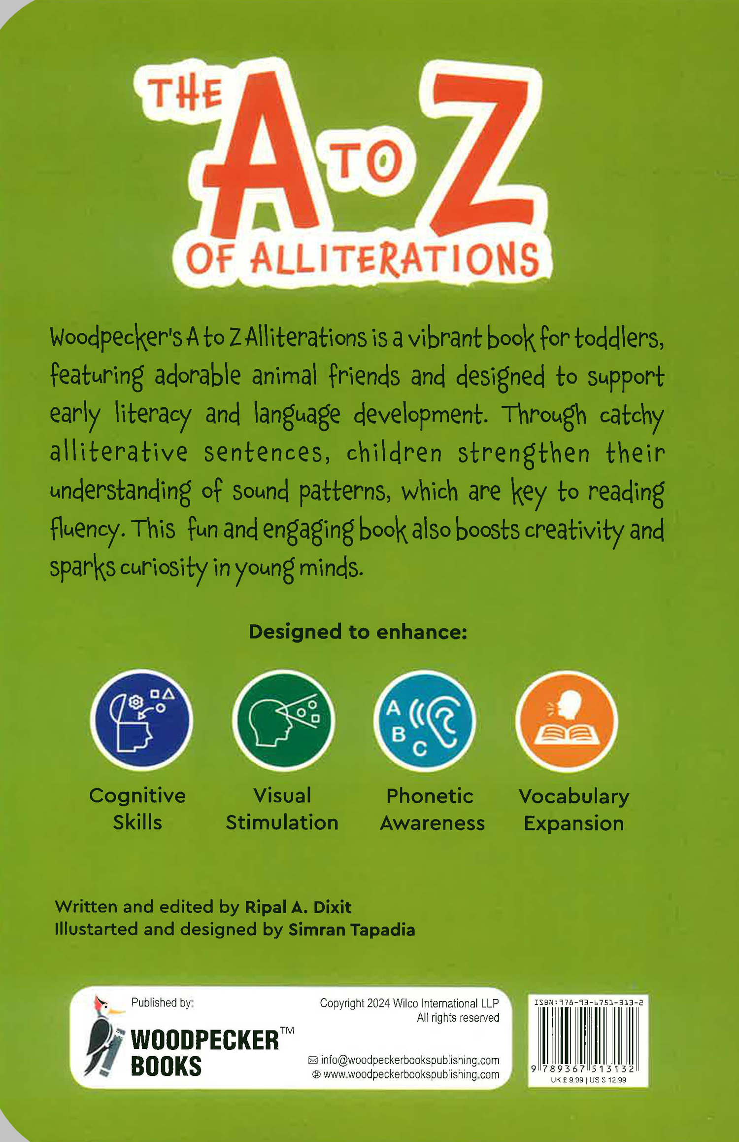 Woodpecker's A to Z Alliterations is a vibrant book for toddlers, featuring adorable animal friends and designed to support early literacy and language development. Through catchy alliterative sentences, children strengthen their understanding of sound patterns, which are key to reading fluency. This fun and engaging book also boosts creativity and sparks curiosity in young minds.