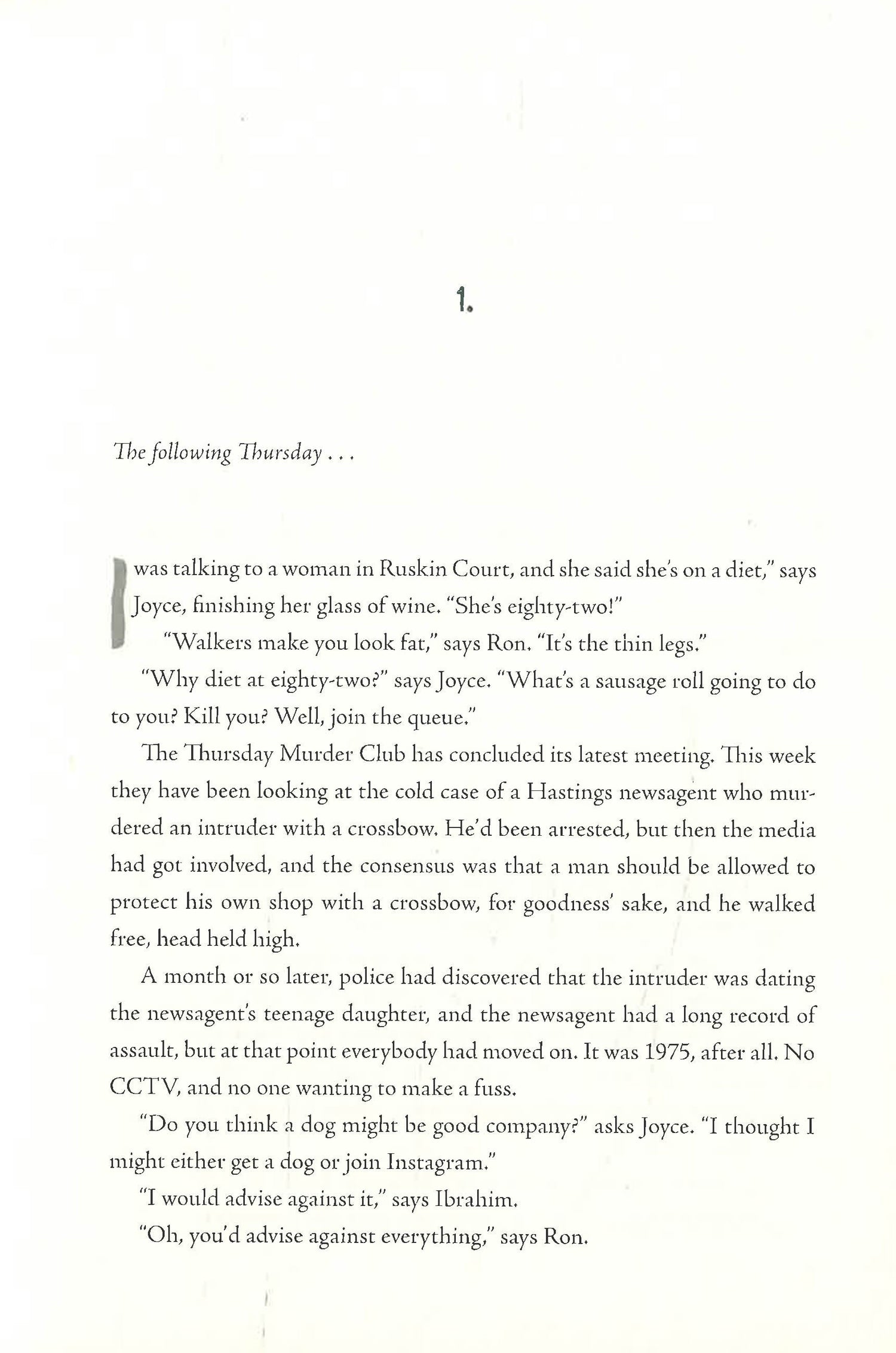 Then, as night follows day, the first body is found. But not the last. Elizabeth, Joyce, Ron and Ibrahim are up against a ruthless murderer who wouldn’t bat an eyelid at knocking off four septuagenarians. Can our four friends catch the killer before the killer catches them? And if they find the diamonds, too? Well, wouldn’t that be a bonus? You should never put anything beyond the Thursday Murder Club.