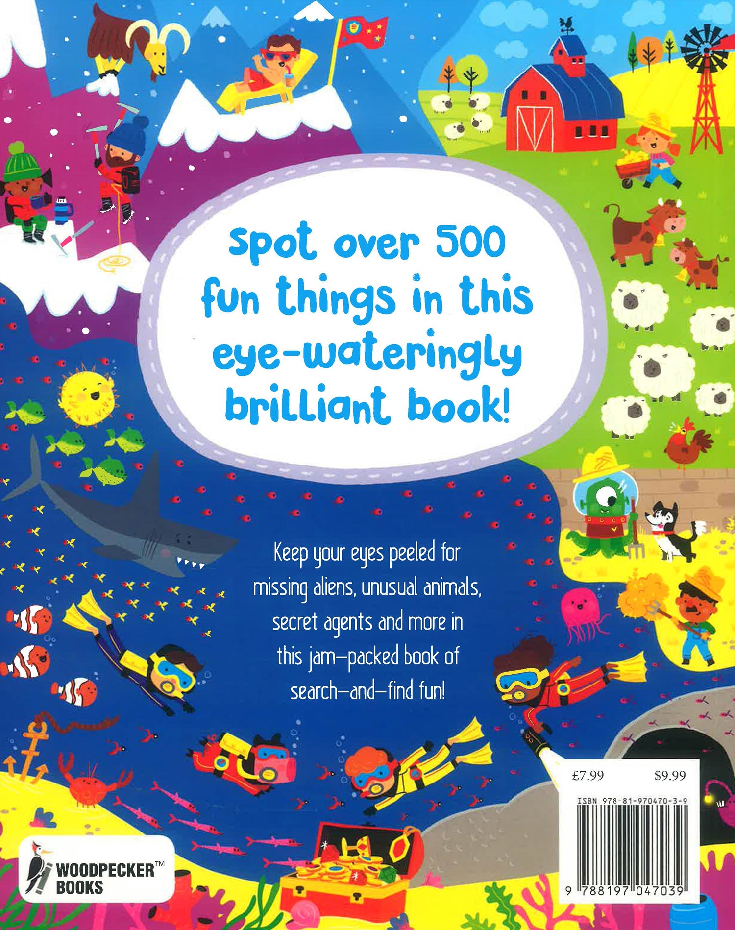 Keep your eyes peeled for missing aliens, unusual animals, secret agents and more in this jam-packed book of search-and-find fun!