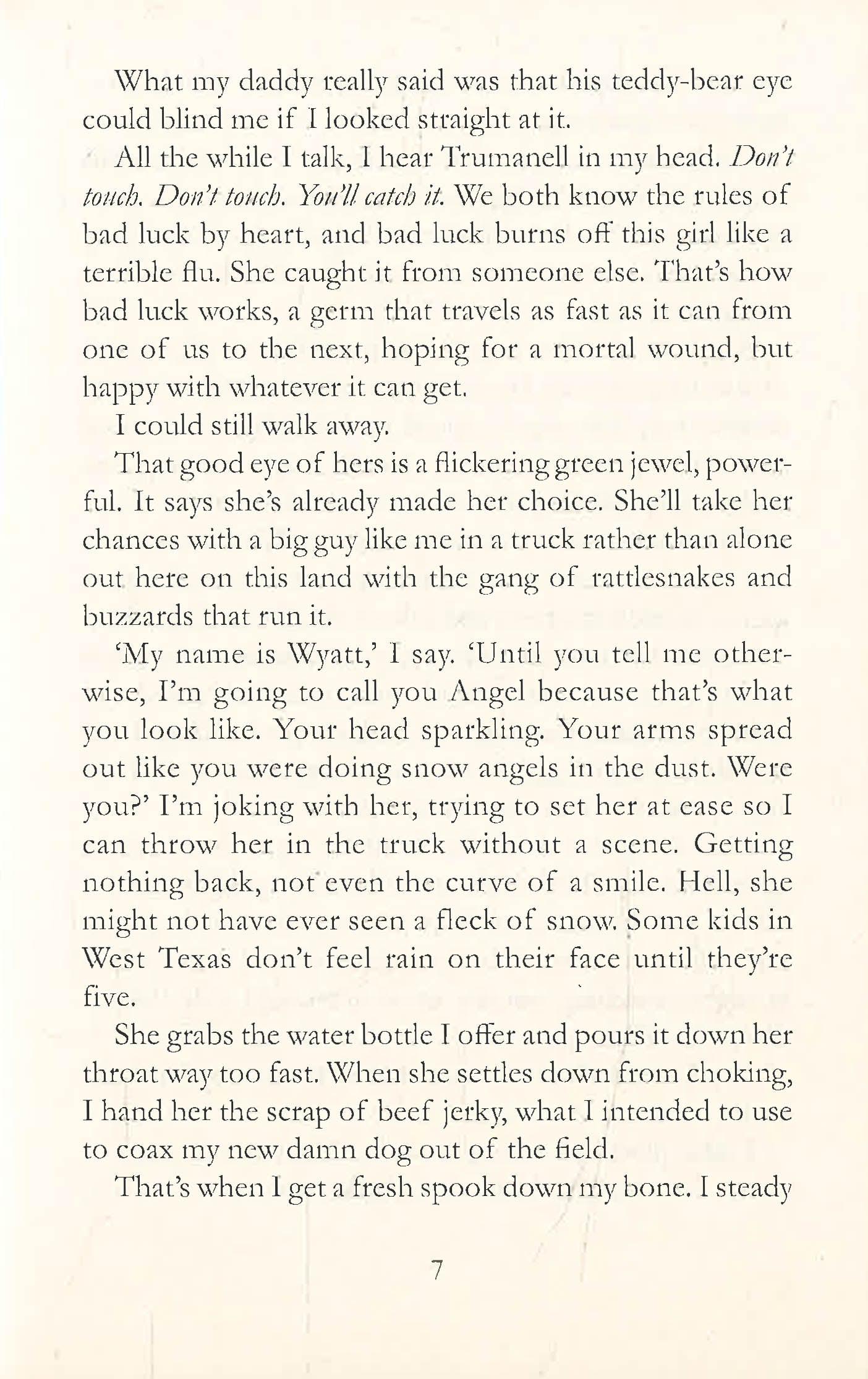 Yet when Wyatt finds a lost girl in a field, he convinces himself she's a sign. Someone to lead him to his sister. To clear his name.