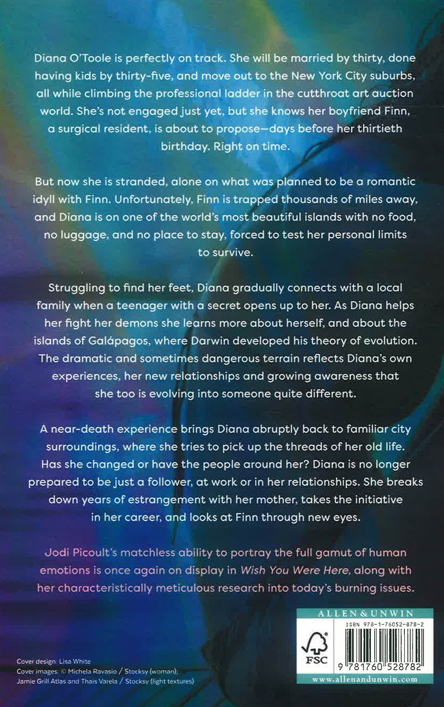 Diana O'Toole is perfectly on track. She will be married by thirty, done having kids by thirty-five, and move out to the New York City suburbs, all while climbing the professional ladder in the cutthroat art auction world. She's not engaged just yet, but she knows her boyfriend Finn, a surgical resident, is about to propose - days before her thirtieth birthday. Right on time. But now she is stranded, alone on what was planned to be a romantic idyll with Finn. Unfortunately, Finn is trapped thousands of miles away, and Diana is on one of the world's most beautiful islands with no food, no luggage, and no place to stay, forced to test her personal limits to survive. Struggling to find her feet, Diana gradually connects with a local family when a teenager with a secret opens up to her. As Diana helps her fight her demons she learns more about herself, and about the islands of Galapagos, where Darwin developed his theory of evolution. The dramatic and sometimes dangerous terrain reflects Diana's own experiences, her new relationships and growing awareness that she too is evolving into someone quite different. A near-death experience brings Diana abruptly back to familiar city surroundings, where she tries to pick up the threads of her old life. Has she changed or have the people around her? Diana is no longer prepared to be just a follower, at work or in her relationships. She breaks down years of estrangement with her mother, takes the initiative in her career, and looks at Finn through new eyes. Jodi Picoult's matchless ability to portray the full gamut of human emotions is once again on display in Wish You Were Here, along with her characteristically meticulous research into today's burning issues.