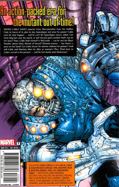 An action-packed era for the mutant out of time! When Cable saves reporter Irene Merryweather from the Hellfire Club, he learns of their plot to slay Apocalypse and seize his power! Cable can't let that happen -and he can't let Apocalypse return either. Can Irene help him save the world, or will she just paint another bull's eye on her back? Then, Cable finds himself in Wakanda...can he and the Black Panther silence Klaw, Master of Sound? Domino returns -but there's a price on her head! Can Cable rescue his mentor without his powers? And will Cable and Machine Man be allies or enemies? Plus: Flash back to Cable's arrival in the present -and his fi rst battle with Wolverine! COLLECTING: CABLE (1993) -1, 48-58; CABLE & MACHINE MAN ANNUAL 1998; MACHINE MAN & BASTION ANNUAL 1998; WOLVERINE/CABLE 1