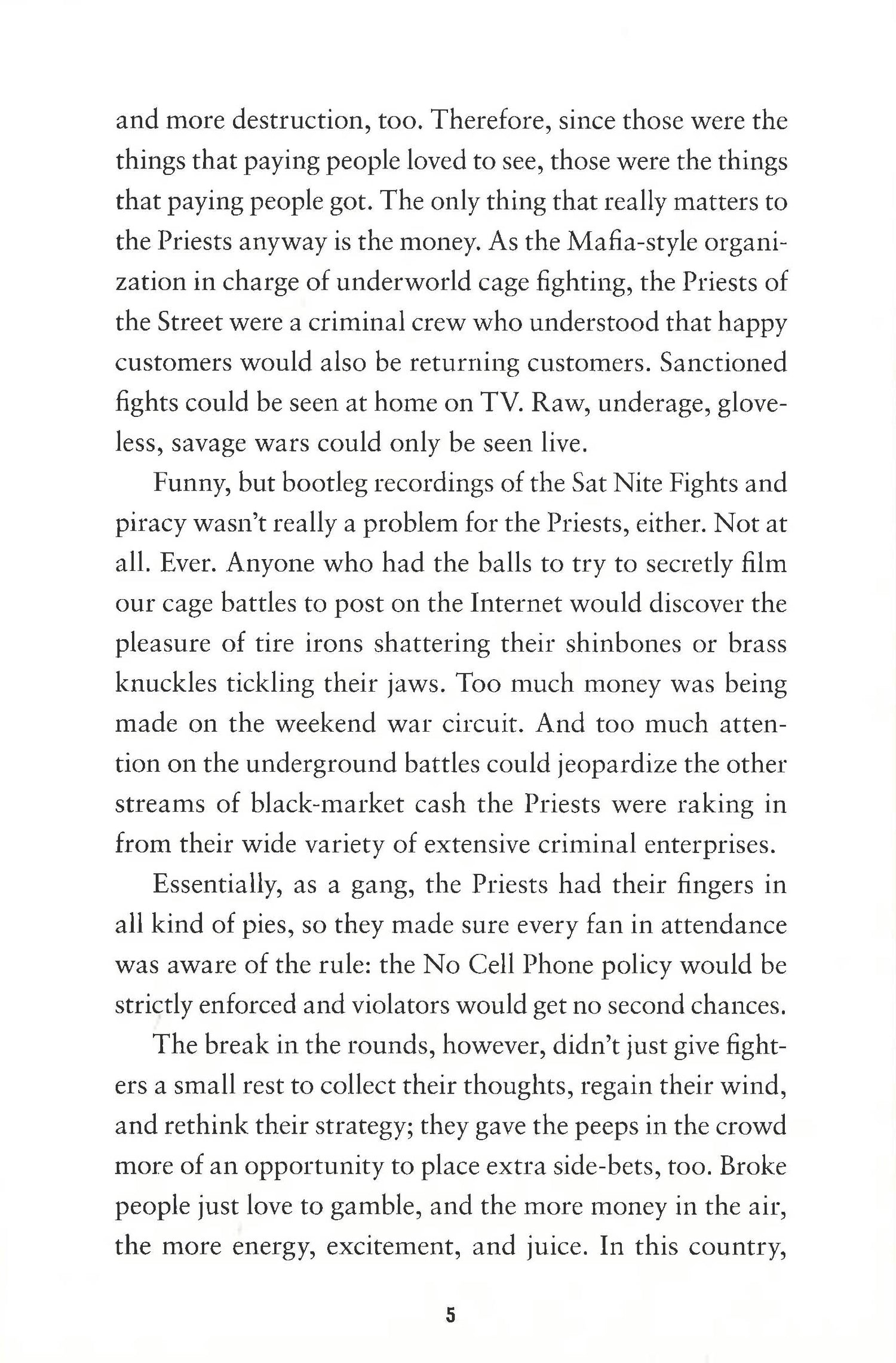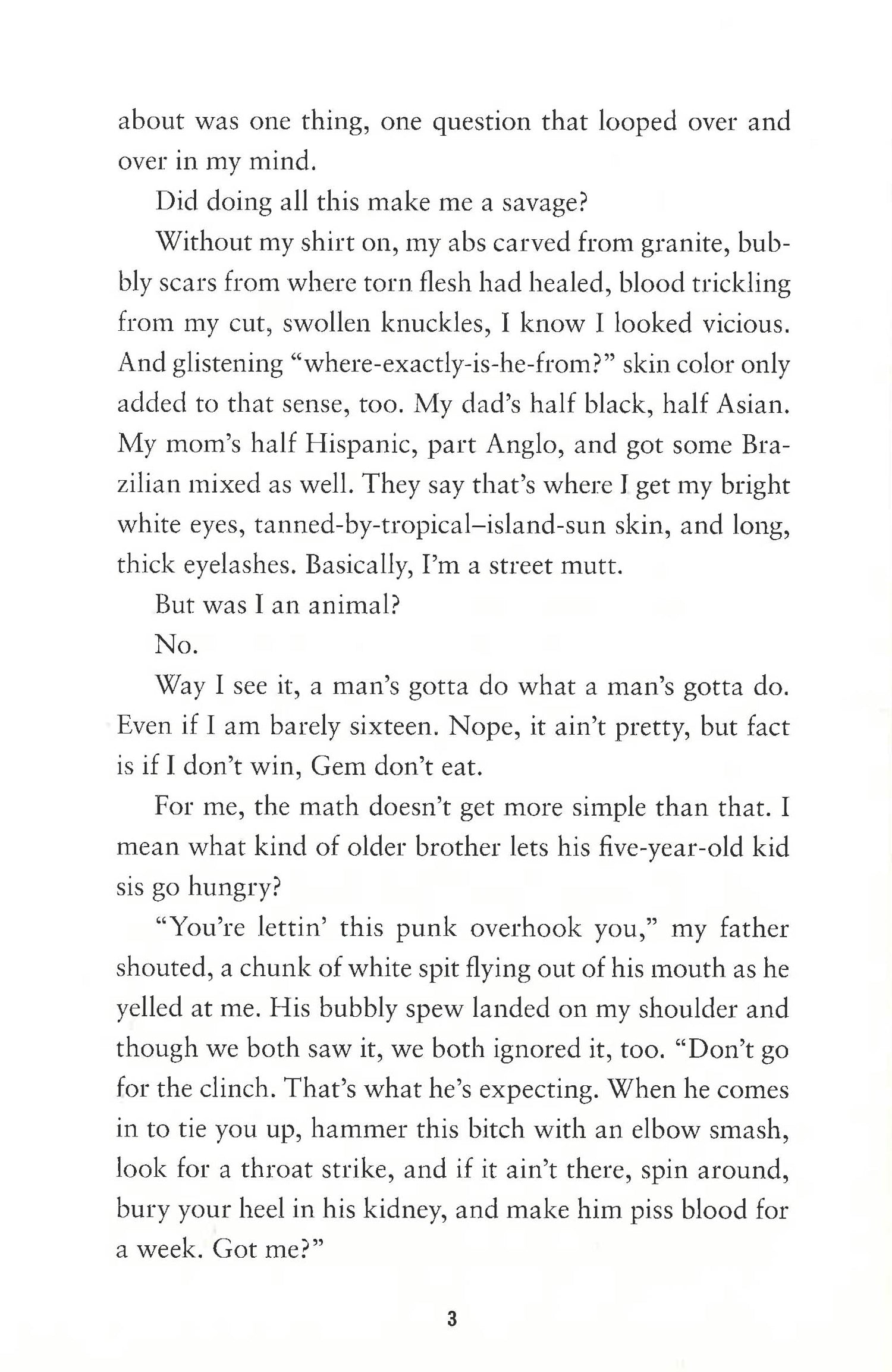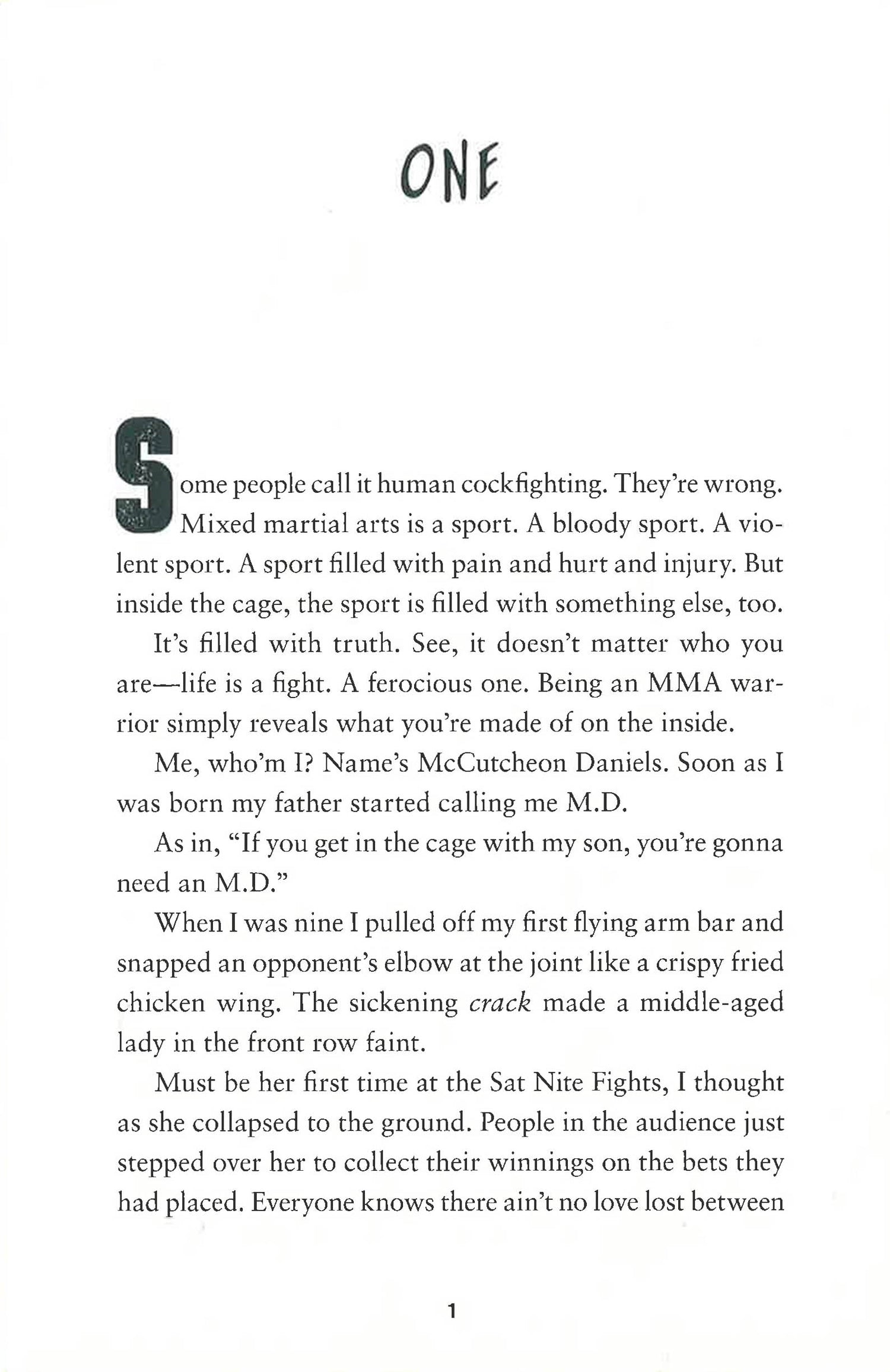 McCutcheon Daniels' life is full of bone-cracking violence. As a star fighter in the gritty underground Mixed Martial Arts circuit in the poorest section of Detroit, McCutcheon fights under the tutelage of his volatile and violent father, not so much for himself but to survive as protector of his beloved five-year old sister, Gemma. We get to know McCutcheon as he battles opponents who are literally trying to kill him. Mr. Freedman, his science teacher, spots his intellectual potential, befriends him, and encourages him to enter the lottery for a scholarship to an elite charter school so he can obtain a first-class education. He is at first dead-set against the idea, and of course his tyrannical father forbids it. But the school's headmaster, Kaitlyn, a student assigned to be his guide, and Mr. Freedman continue to encourage him to consider it. His father and the Priests, the local Mafia-like crew that run Detroit's organized crime, have other plans for McCutcheon. For them, he is simply a tool to make them money. And when that cash flow is threatened, his father hits McCutcheon where it hurts most-he hides Gemma and threatens his own son that he'll never see his beloved sister again if he doesn't play by the Priests' rules.For the first time in his life, McCutcheon reaches out for help. Mr. Freedman turns out to have a very mysterious past and not only helps McCutcheon find his sister but also his mother who had simply disappeared on McCutcheon's 13th birthday. All seems well, but happy endings aren't really something McCutcheon feels he can rely on. And he may be right.