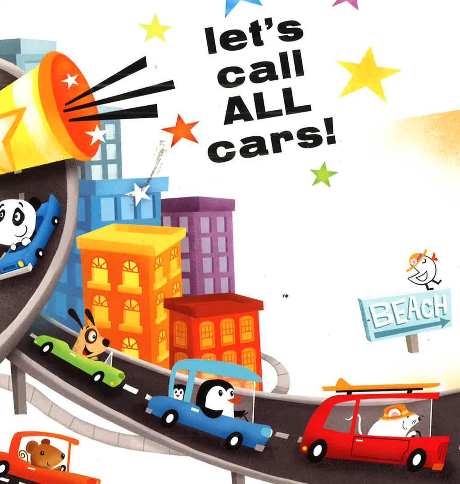 Big cars, small cars, let's call ALL cars! This bouncy text explores the wonderful world of cars zipping up, down, fast, and slow. A perfect basic concept books for eager young learners from the author of Tons of Trucks. Then cruise into bedtime! Rest cars, Hush cars No more rush, cars. Cars pull in, turn off the light. Sweet dreams, sleepy cars...goodnight! Filled with vibrant art, adorable animal characters, and cars of all kinds from love bugs to the demolition derby, Calling All Cars is for every child who loves to read about things that go! Surprise bonus -- follow one long road throughout this vividly imagined world and don't miss the hidden clues in the artwork!