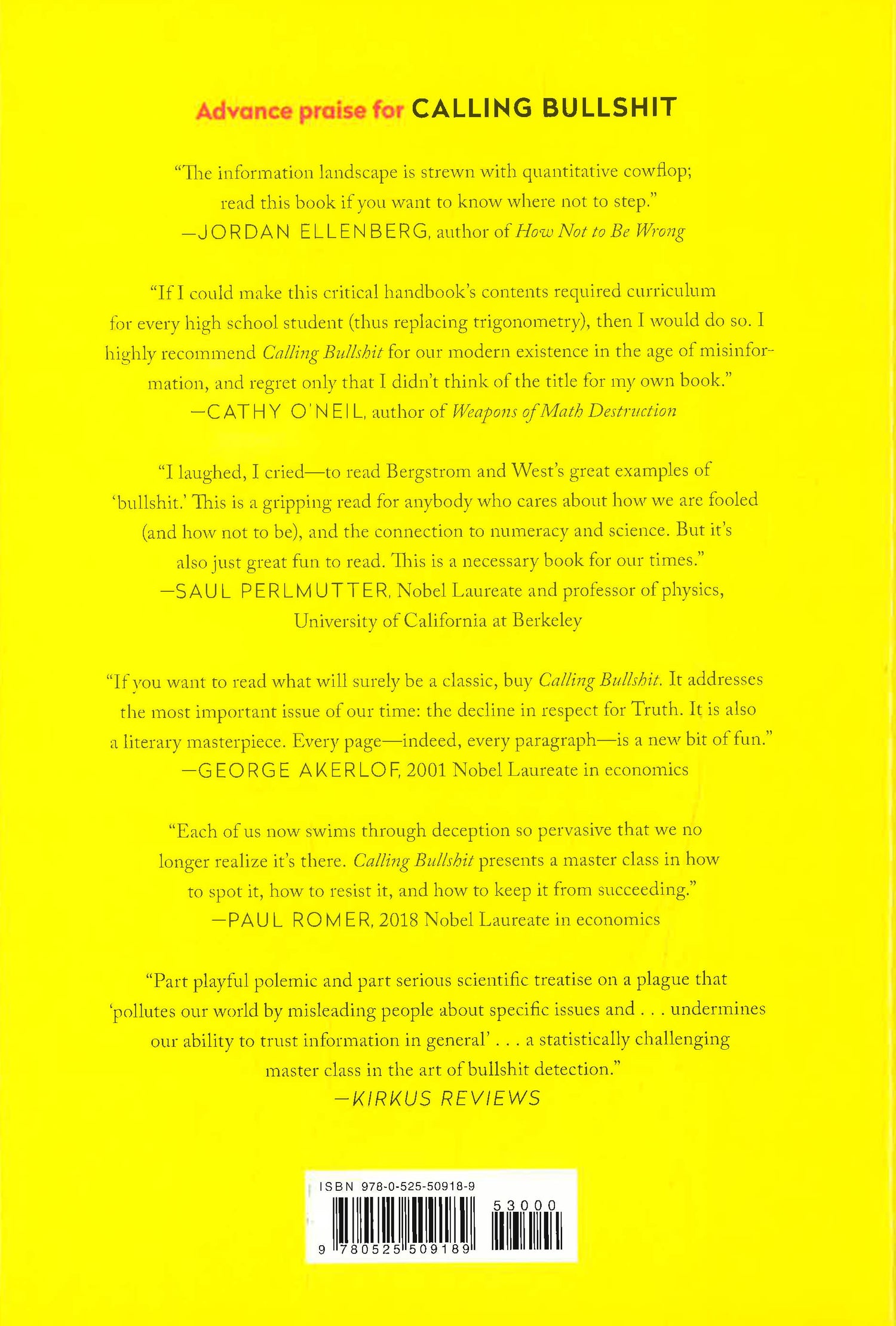 Misinformation, disinformation, and fake news abound and it’s increasingly difficult to know what’s true. Our media environment has become hyperpartisan. Science is conducted by press release. Startup culture elevates bullshit to high art. We are fairly well equipped to spot the sort of old-school bullshit that is based in fancy rhetoric and weasel words, but most of us don’t feel qualified to challenge the avalanche of new-school bullshit presented in the language of math, science, or statistics. In Calling Bullshit, Professors Carl Bergstrom and Jevin West give us a set of powerful tools to cut through the most intimidating data.