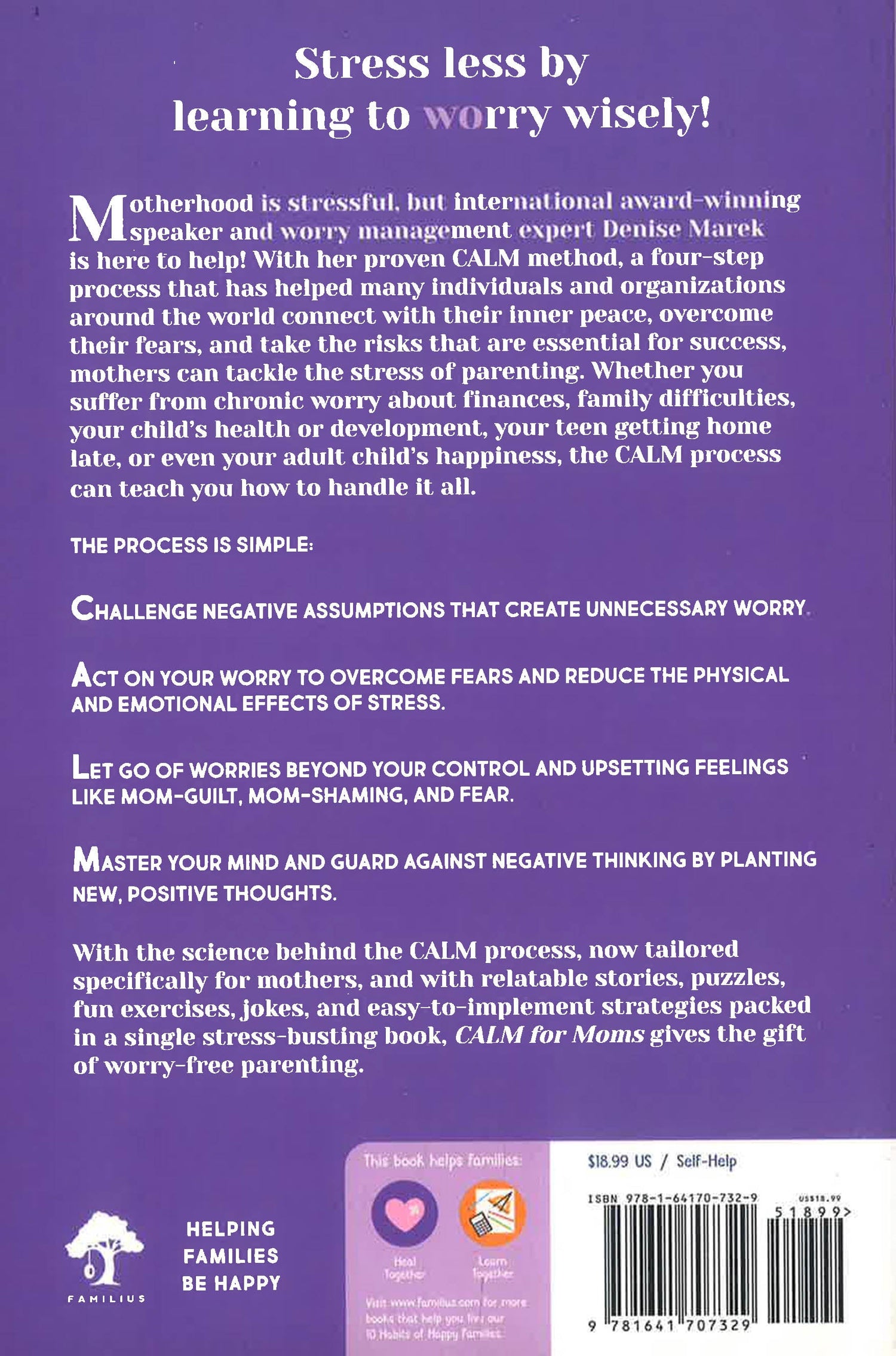 Motherhood is stressful, but international award-winning speaker and worry management expert Denise Marek is here to tell you that you can stress less by learning to worry wisely! With her proven CALM method, a four-step process that has helped many individuals and organizations around the world connect with their inner peace, overcome their fears, and take the risks that are essential for success, mothers can tackle the stress of parenting. Whether you suffer from chronic worry about finances, family difficulties, your children’s happiness, or even your teen getting home late, the CALM process can teach you how to handle it all.