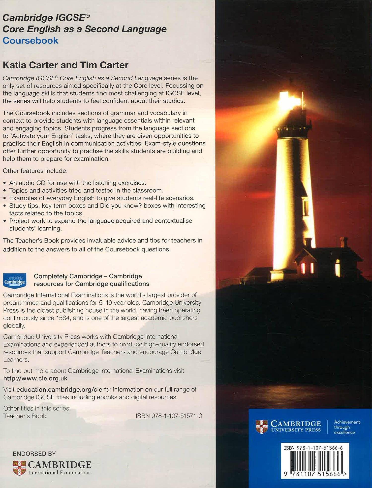 Cambridge IGCSE® Core English as a Second Language series has a strong focus on contextualised grammar and vocabulary and will help students who want to succeed at Core IGCSE level. The Coursebook includes productive stages called 'Activate your English' which are project sections where students can practise their English in communication activities. Exam-style questions allow students to practise their English and an audio CD is included for use with the listening exercises. The Teacher's Book provides invaluable advice and tips for teachers from experienced authors, in addition to the answers to all of the Coursebook questions.