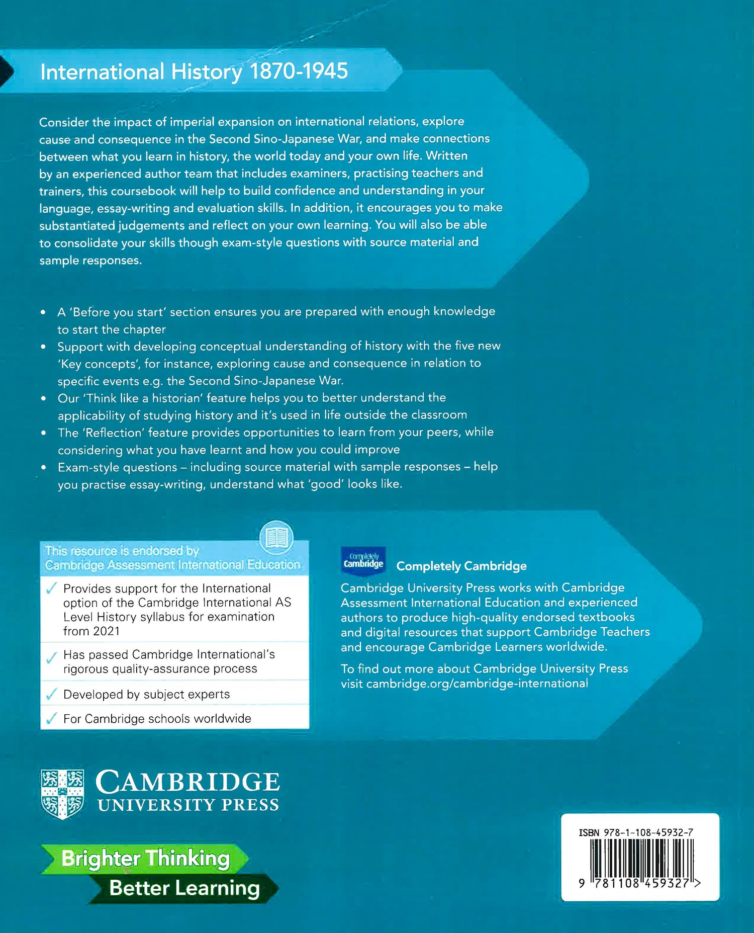 This series is for the Cambridge International AS History syllabus (9489) for examination from 2021. Written by an author with experience writing, examining and teaching, this coursebook supports the Cambridge International AS History syllabus. With increased depth of coverage, this coursebook helps build confidence and understanding in language, essay-writing and evaluation skills. The coursebook also develops students' conceptual understanding of history with the five new 'Key concepts', for example exploring cause and consequence in the Second Sino-Japanese War. In addition, it encourages individuals to make substantiated judgments and reflect on their own learning. Students can also consolidate their skills though exam-style questions with source material and sample responses.
