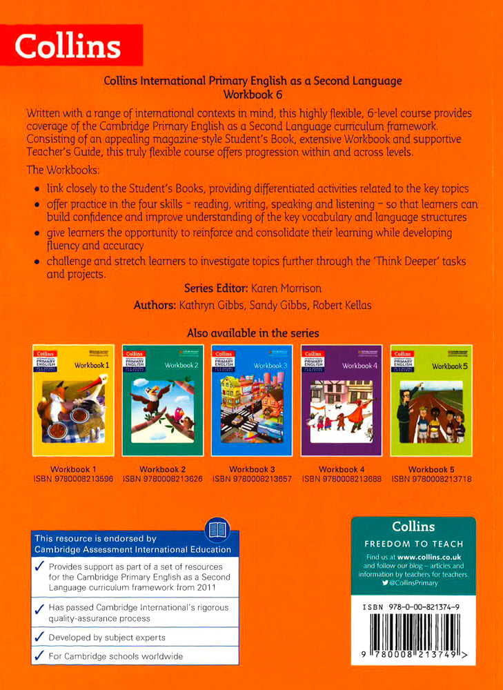 Written with a range of international contexts in mind, this highly flexible, 6-level course provides coverage of the Cambridge Primary English as a Second Language syllabus. Consisting of an appealing, magazine style Student Book, extensive Workbook and supportive Teacher's Guide, the course offers progression within and across levels.Written with a range of international contexts in mind, this highly flexible, 6-level course provides coverage of the Cambridge Primary English as a Second Language syllabus. Consisting of an appealing, magazine style Student Book, extensive Workbook and supportive Teacher's Guide, the course offers progression within and across levels. The Workbooks link closely to the Student Books, providing additional activities related to the key topics presented in the Students Books. Learners are able to practise the four skills - Reading, Writing, Speaking and Listening - and build their confidence and understanding of the key vocabulary and language structures covered in the syllabus. 'Thinking Deeper' tasks and projects challenge learners to stretch themselves by spending longer thinking about a topic and investigating it further.The workbooks should be used together with the Student Books, to provide full syllabus coverage and give learners the opportunity to reinforce and consolidate their learning, while developing fluency and accuracy. Provides support as part of a set of resources for the Cambridge Primary curriculum framework from 2011. This title is endorsed by Cambridge Assessment International Education.