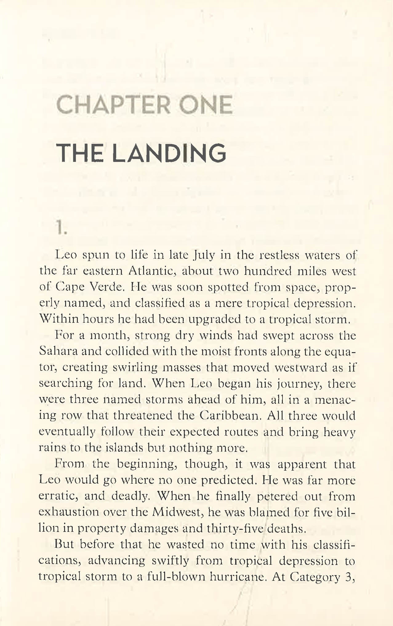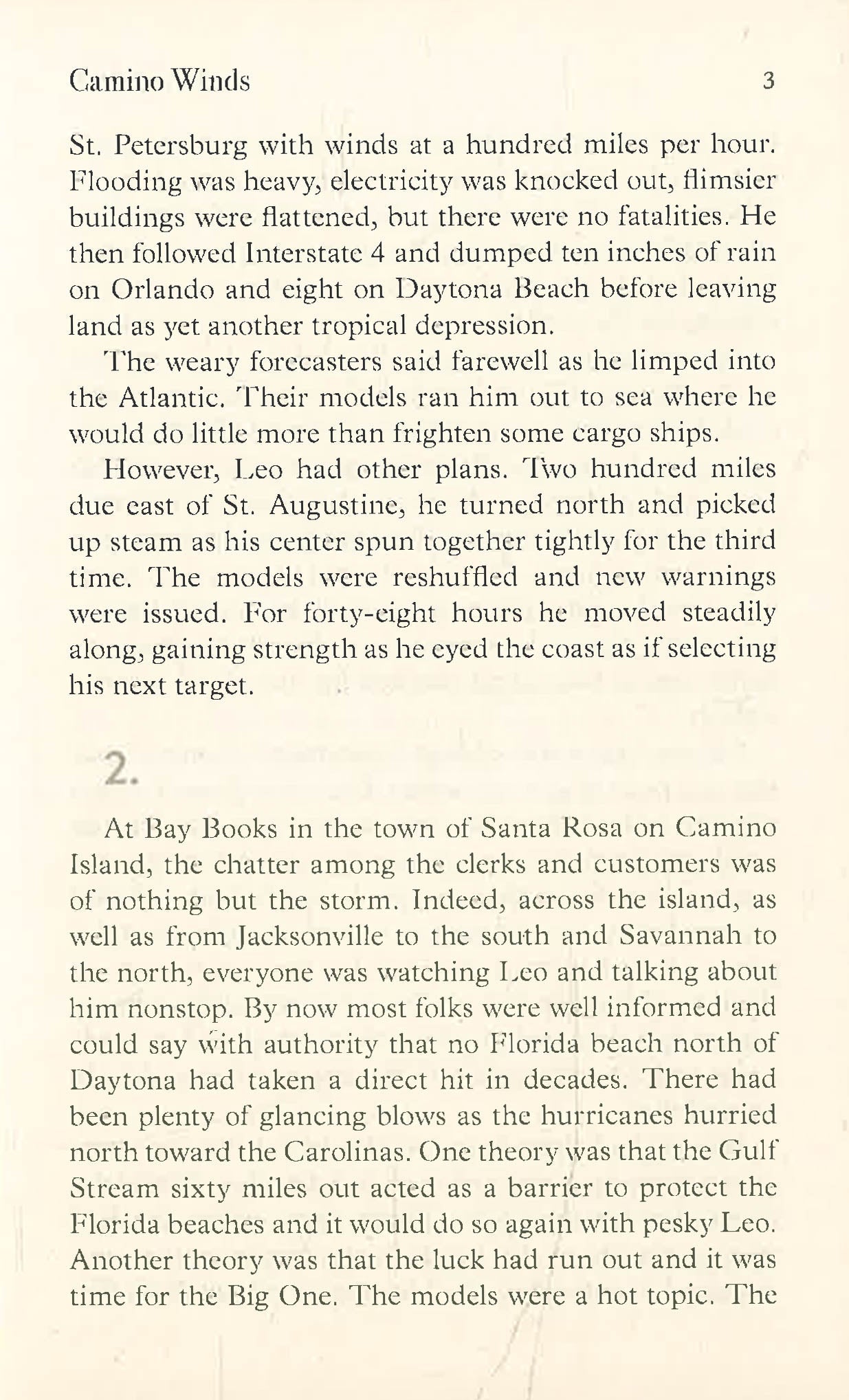 When Hurricane Leo threatens Florida's Camino Island, the Governor is quick to issue an evacuation order. Most residents flee but a small group of diehards decide to ride it out. Amongst them is Bruce Cable, proprietor of Bay Books in downtown Santa Rosa.