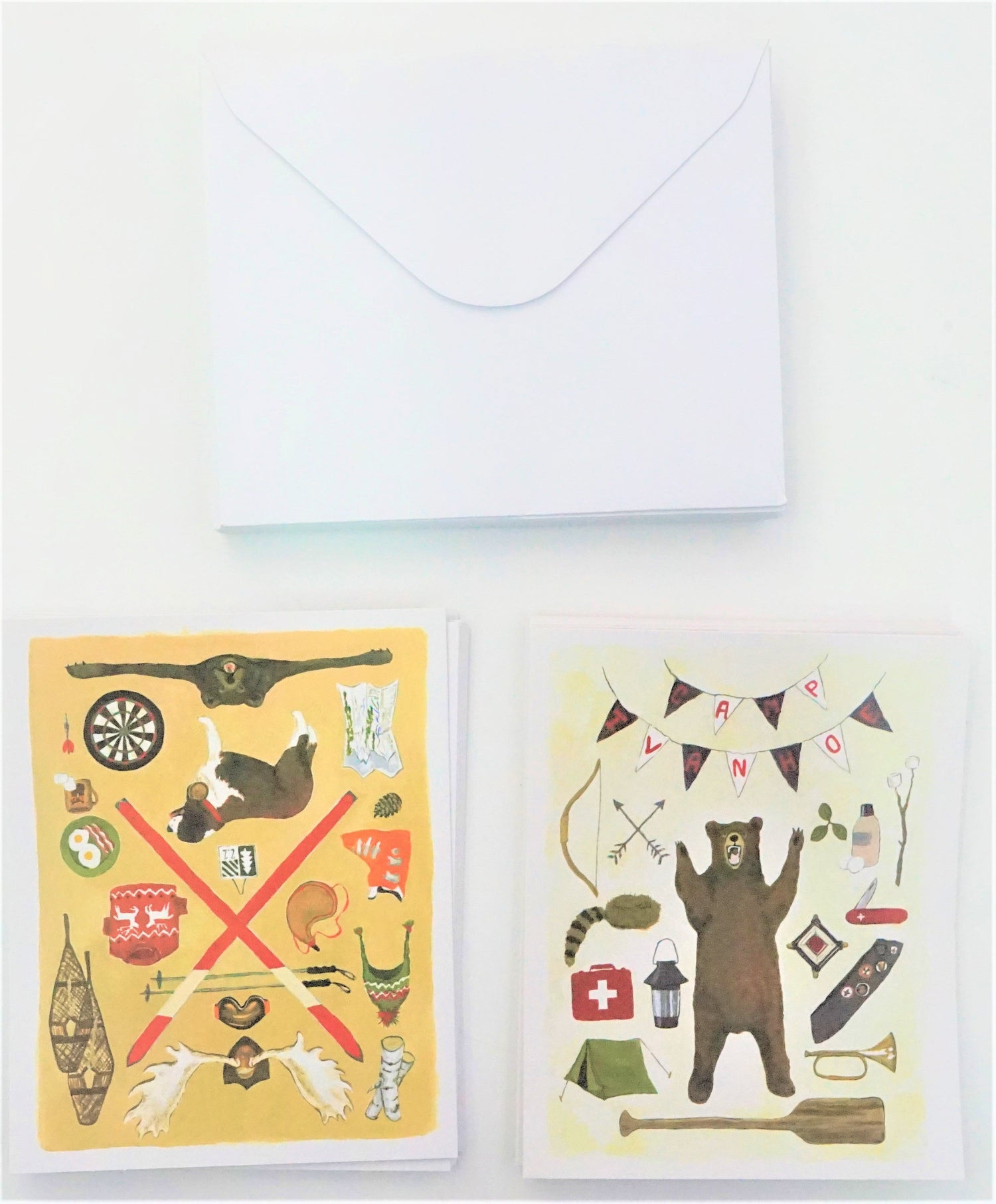 GreenNotes are our environmentally friendly set of notecards with on-trend designs and fresh art. The Camp + Cabin GreenNotes boxed notecard set with the lively camping and cross-country ski gear motifs are fun, rustic notes for any occasion. Each reusable, fun corrugated box contains 16 notecards & envelopes, 8 each of 2 images, printed with soy-based inks on environmentally friendly materials. Our GreenNotes focus on function and form with vibrant, full-color artwork. Cards are printed on uncoated paper stock, bundled together with a decorative twine tie.
