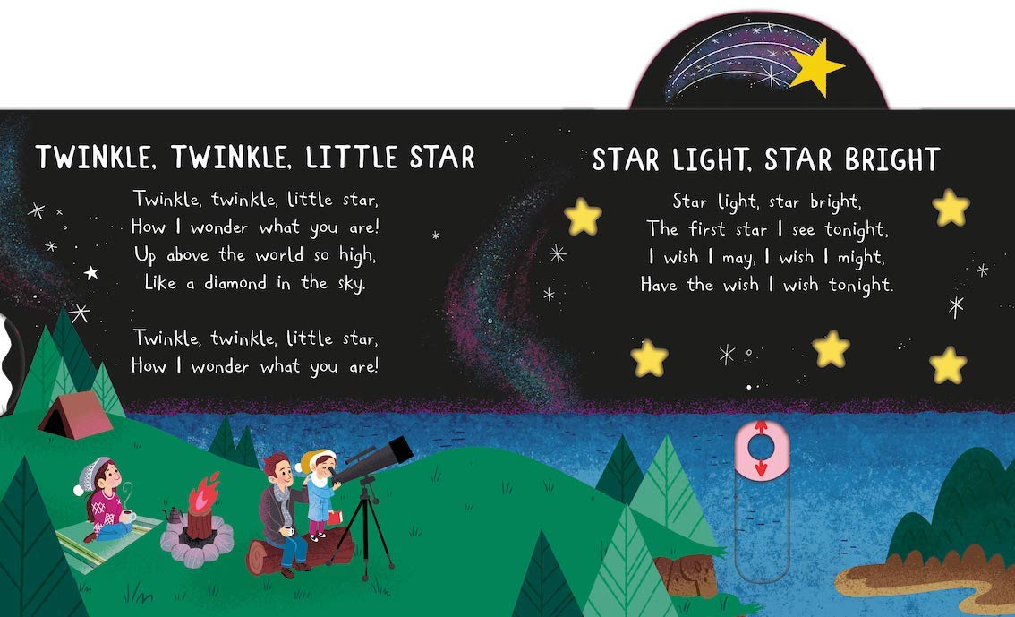 Watch the cow jump over the moon, rock the baby's cradle and gaze at all the twinkly stars in the night sky before bed in Bedtime Rhymes.