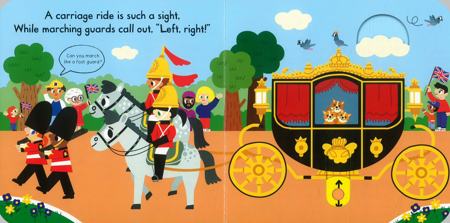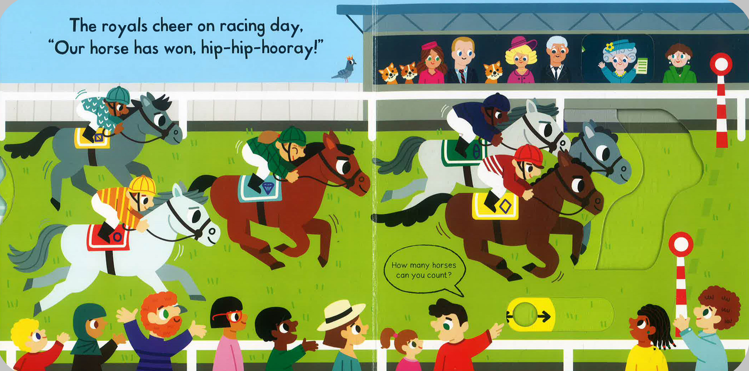 Get to know the Busy Royal Family and join in the Queen's 95th birthday celebrations! Push, pull and slide the tabs to help the Queen choose her outfit, enjoy a day at the races and go on a fun carriage ride. What better way to celebrate the Queen's 95th birthday?