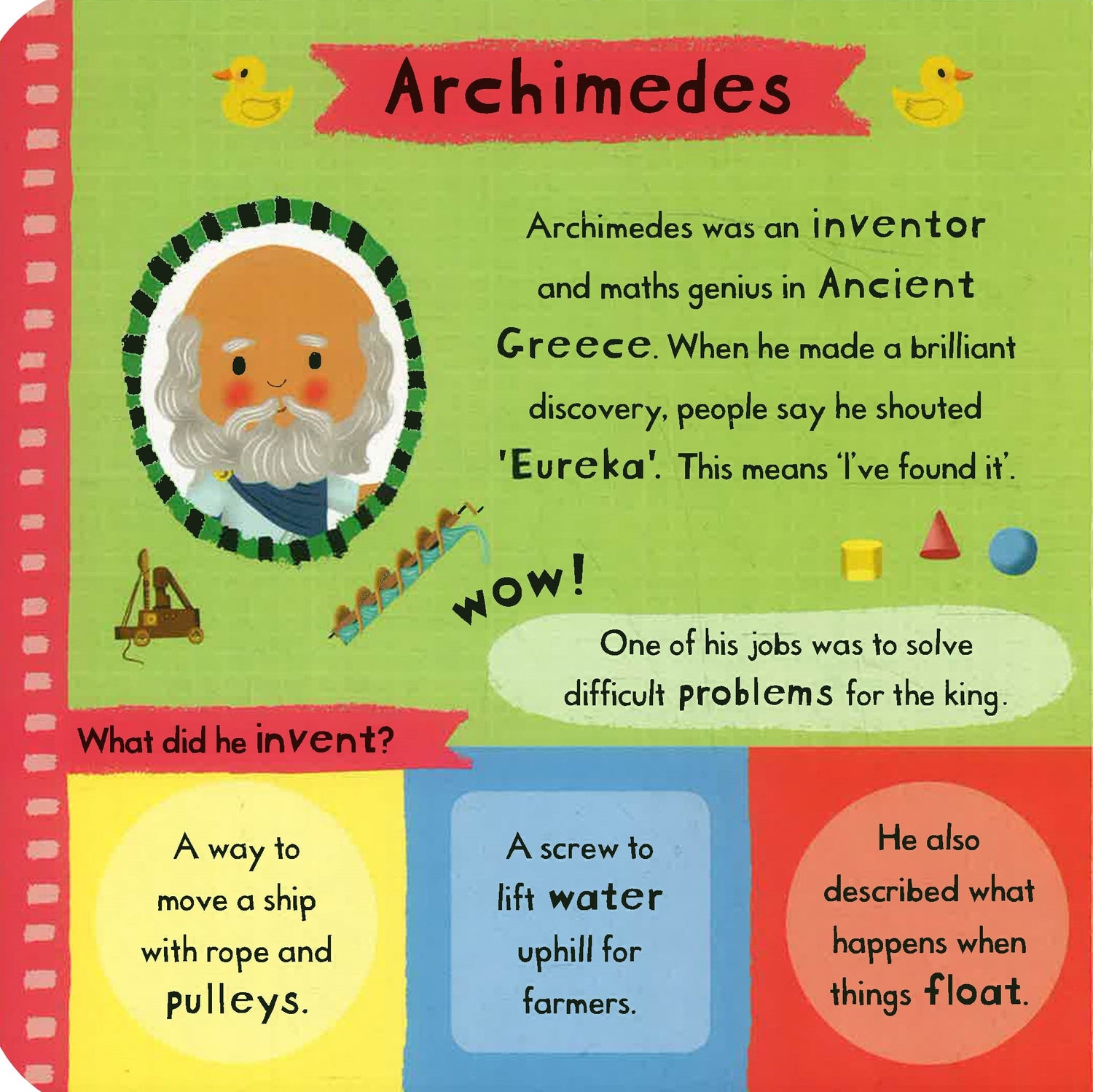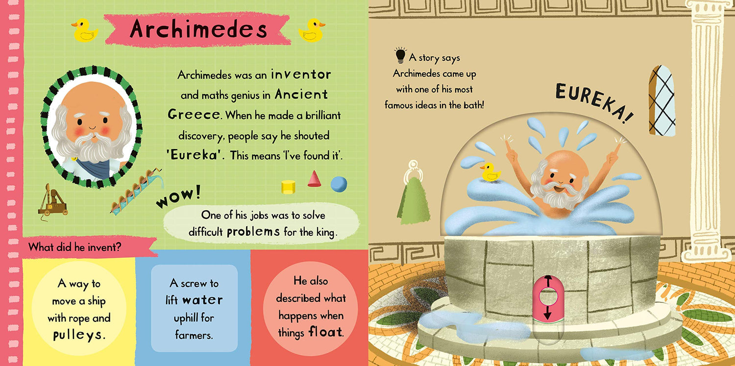 Push, pull and slide the scenes to find out about Archimedes, Patricia Bath, George Stephenson and Hedy Lamarr, and be inspired by their incredible work.