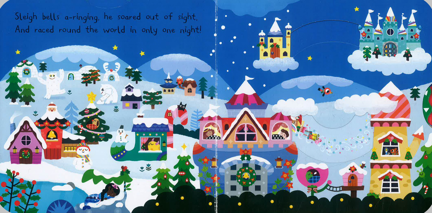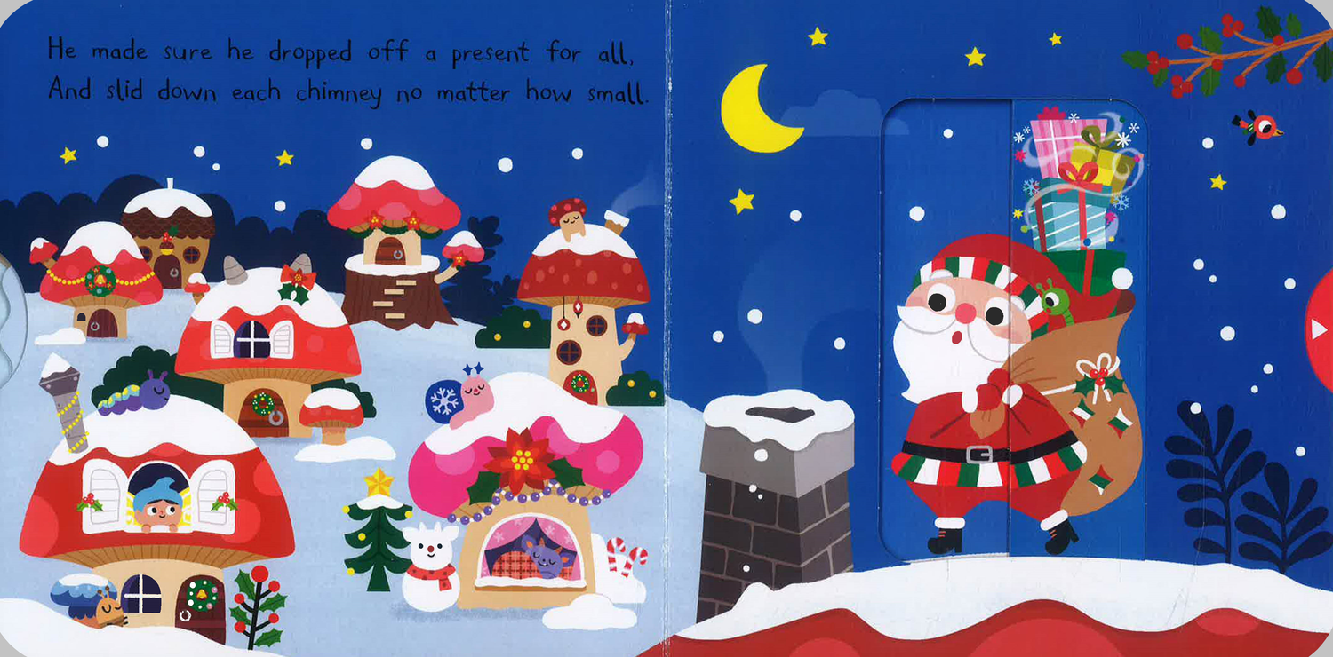 With a sparkly foil cover wheel and push, pull and turn mechanisms, little ones will have lots of fun delivering presents with Santa and finding out just how he gets down all those chimneys!