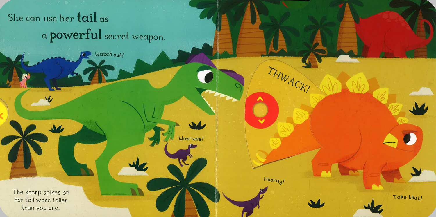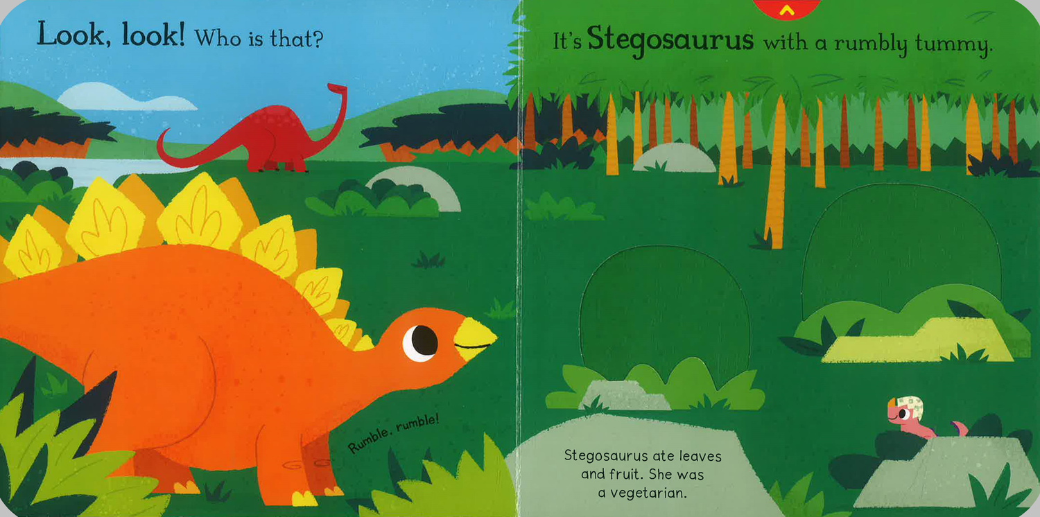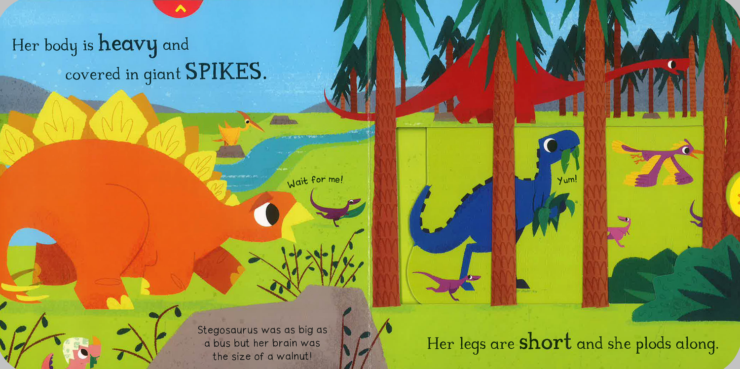 Push, pull and slide the scenes to meet Stegosaurus, one of the spikiest dinosaurs to walk the Earth! Follow her on her search for a leafy lunch, as the other hungry dinos race ahead, leaving her behind.