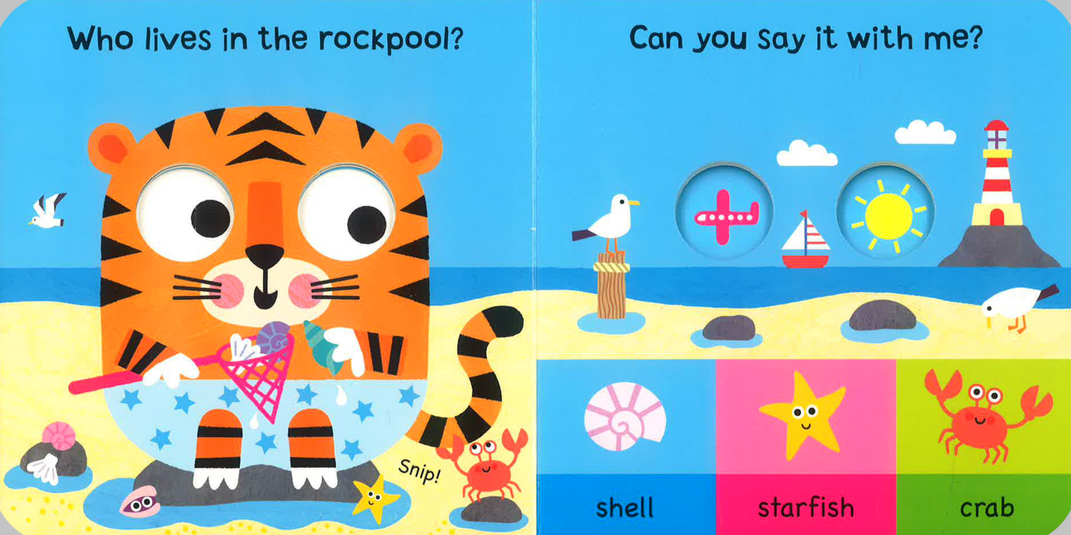 Bold, googly eyes and a sliding mechanism bring this adorable tiger to life, while children share the simple story and point at the bold pictures.